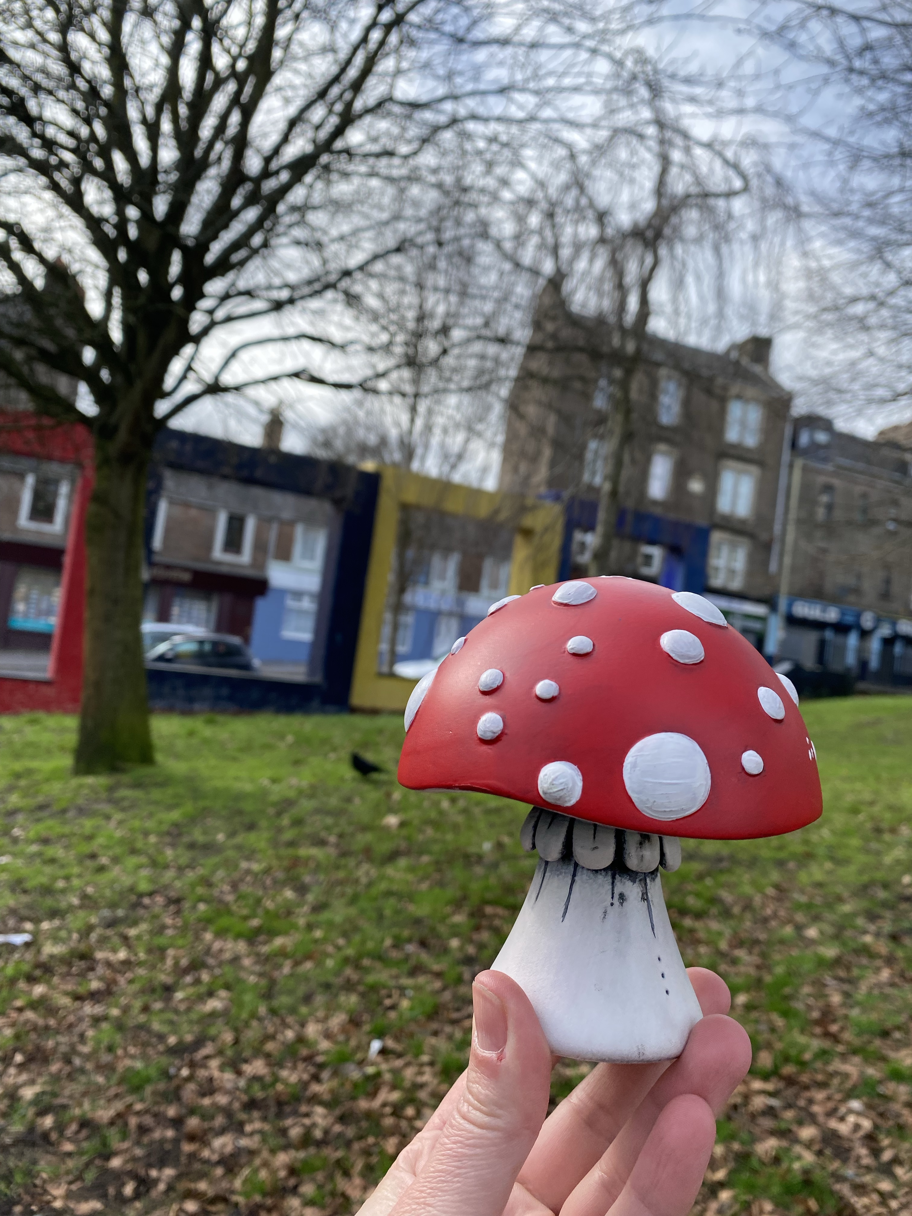 The toadstool sculptures may look simple but they are actually pretty complicated to create! They started out as Suzanne’s 2D sketches that were transformed into a 3D model by Ellie Smith and then in turn printed from resin at Abertay University by Gerry High. Once the sculptures were printed they were all hand finished, painted and lacquered before installation.