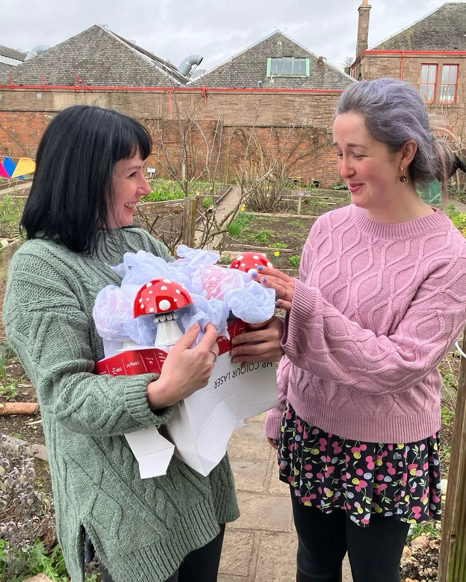 Thanks too to Abertay University, Gerry High and Ellie Smith for helping to produce the toadstool sculptures. To my fab assistant Skye Sutherland for helping with all the extras behind the scenes. Thanks also to Kevin Frediani, and the Dundee Botanic Garden team for all their support with our first Toadstool Trail. Hope Busack too from RSPB Scotland, Fiona Hynes for your educational assistance, Blair McCafferty (Creature Emporium) for an extra helping hand, Cara Pirie for beautiful photos of our launch and Alan and Amanda from SheffMed for our mini toadstools.