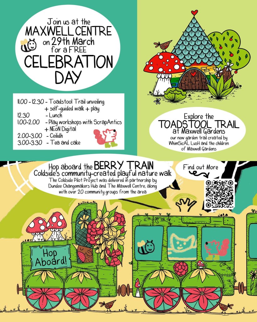 🍄 Before we go any further – Huge thanks to NHS Tayside Charitable Foundation for funding our trail. All the workshops and creating and fun wouldn’t have been possible without your support. It means that we can encourage so many more people in our community to connect with nature through the trail in the garden and feel its health and wellbeing benefits.