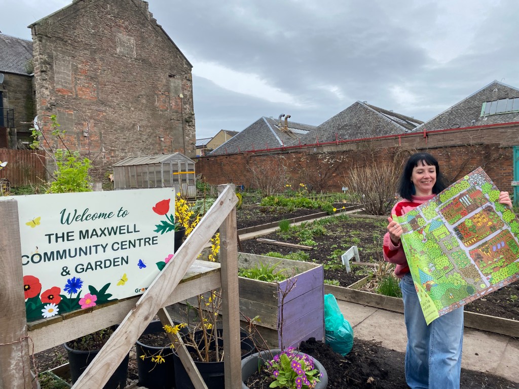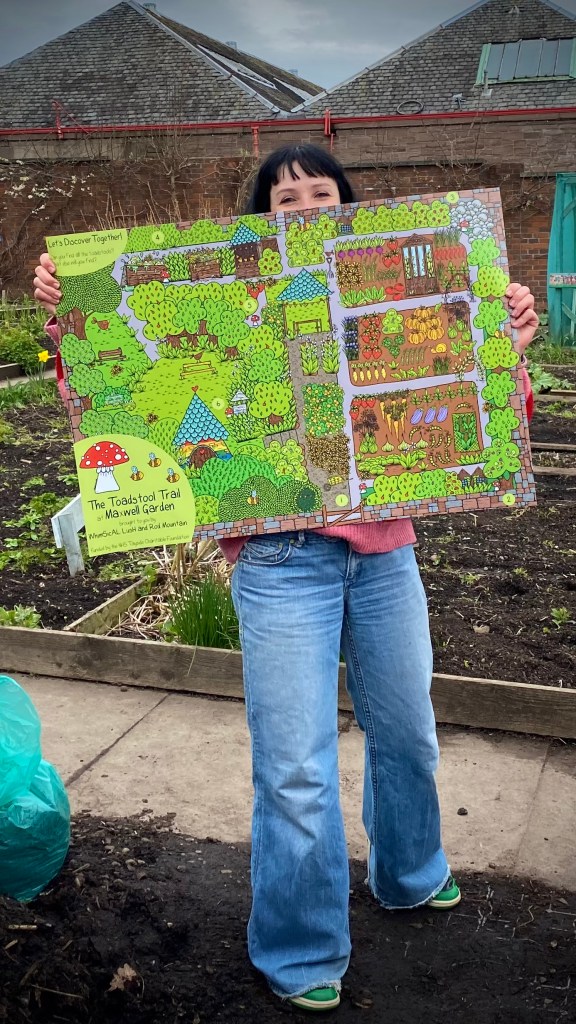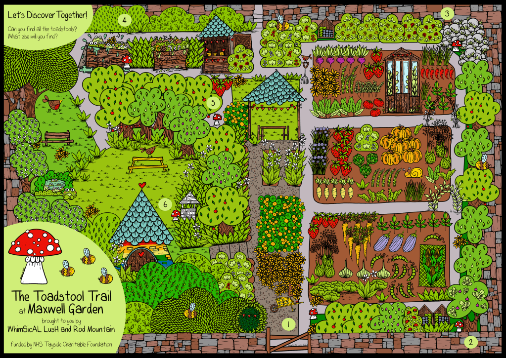 So yes, map! Our lovely first visit last March to the Maxwell Garden and Community Centre ended up with us all getting rather giddy. We had talked all about The Toadstool Trail and all about the wonderful things everyone does in the garden and by the time we left we had all agreed that we would love to launch the second permanent Toadstool Trail in the MAXwell Garden (with the first being in Dundee’s Botanic Garden) – and you can’t have a Toadstool Trail like this without a map!