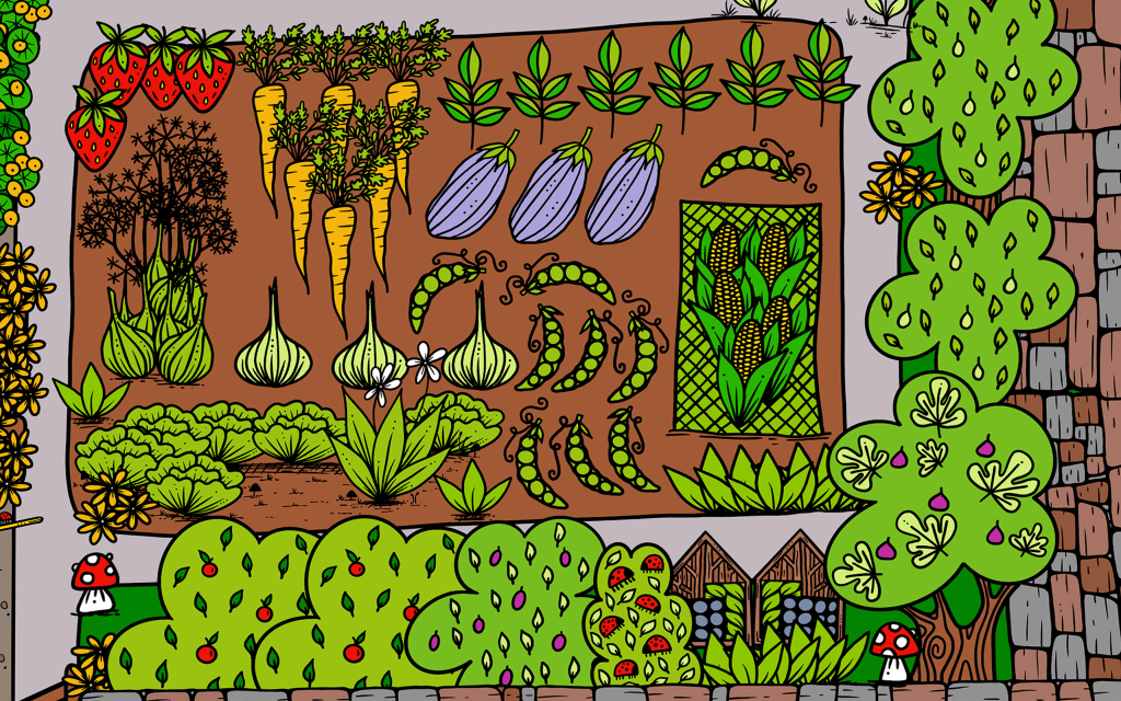 A bee heads North, flying over current bushes, towards one of several bug hotels and the fabled golden raspberries. There is a sheltered seating area where garden feasts are held and fairy gardens created, and the ladybirds balance across their bunting washing line. Edible flowers and fruit is growing all round – perfect for after school snacking.