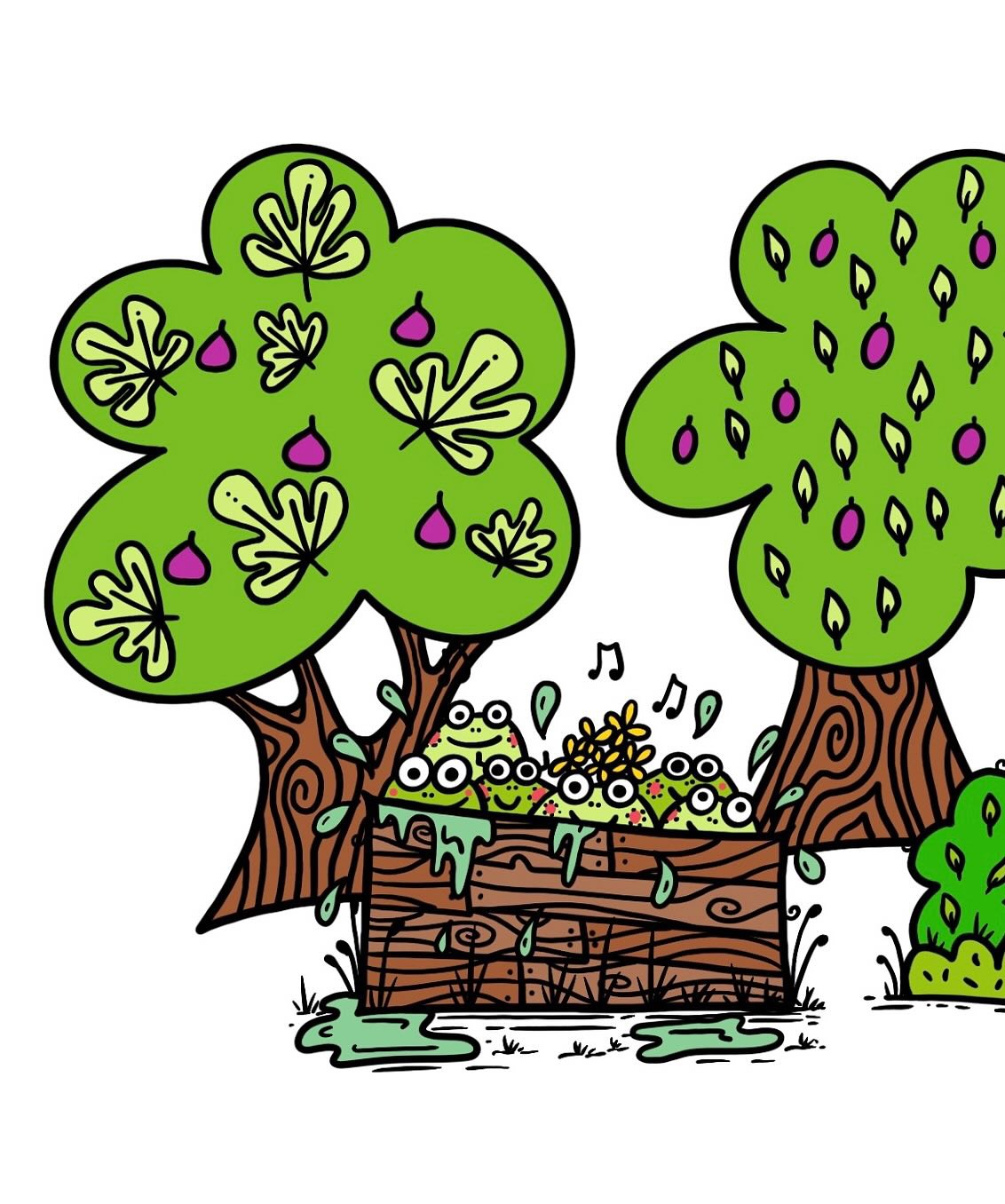 Frogs in ponds, figs, plums, crab apples and pears on trees… Also worms.