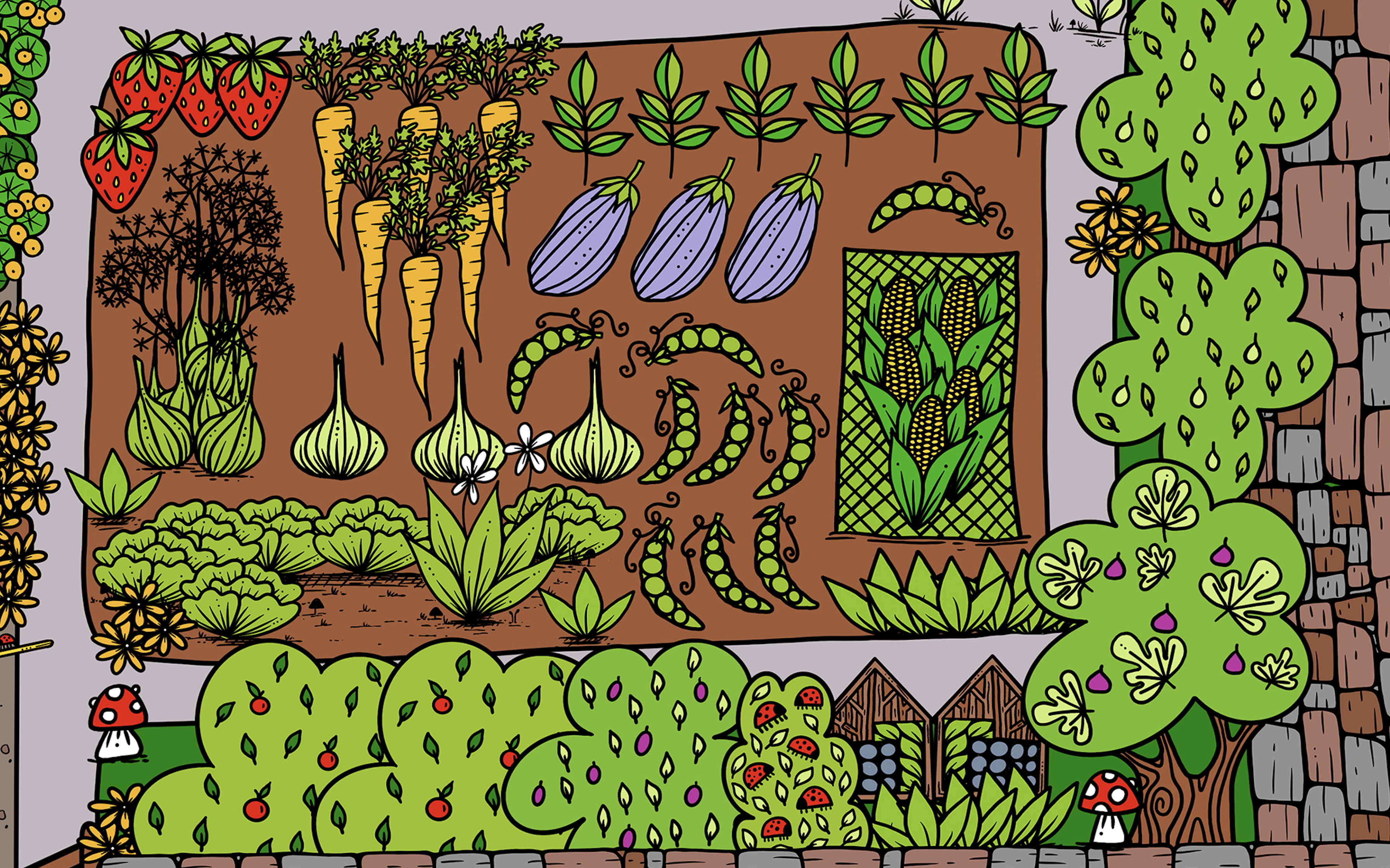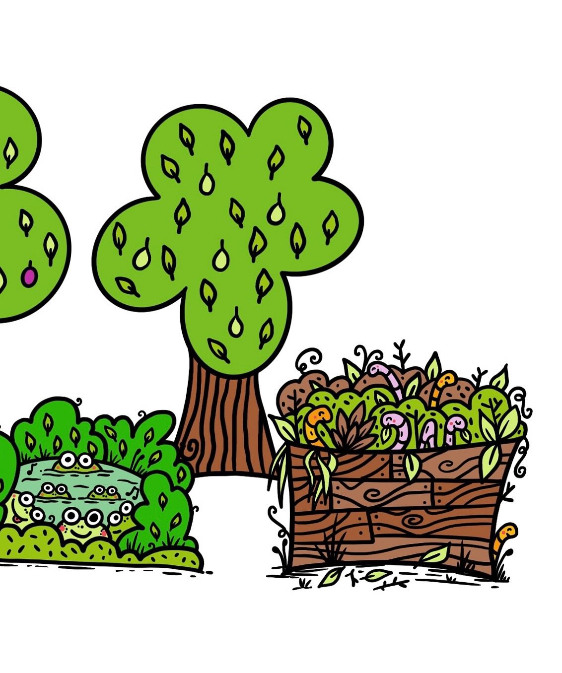Then it was over to me… the illustrator, the listener, the observer, the gatherer of all the ideas. I pulled together everything we had worked on during our garden club workshops and drew and drew and drew. I started with the wall and the paths and then began to fill the garden with trees, bushes, structures, plants, creatures and of course – the toadstools.