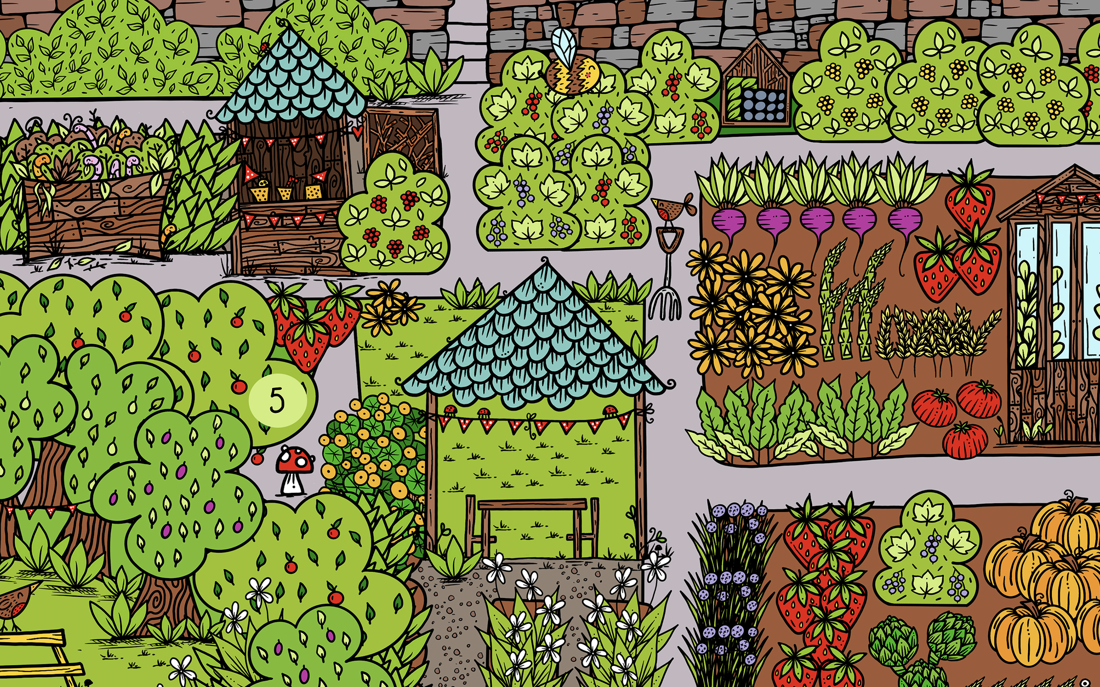 A bee heads North, flying over current bushes, towards one of several bug hotels and the fabled golden raspberries. There is a sheltered seating area where garden feasts are held and fairy gardens created, and the ladybirds balance across their bunting washing line. Edible flowers and fruit is growing all round – perfect for after school snacking.
