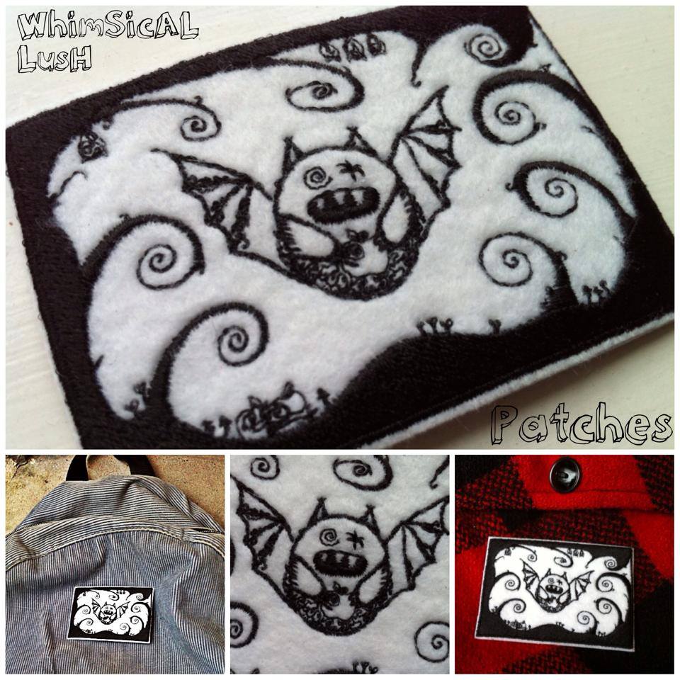 Boris the Bat Sew on Patches: My illustration translated into embroidery by Notions Embroidery Brechin. Originally made for a commission by one of the youngest Boris fans. He wanted a Boris the Bat Backpack. This was the best solution.