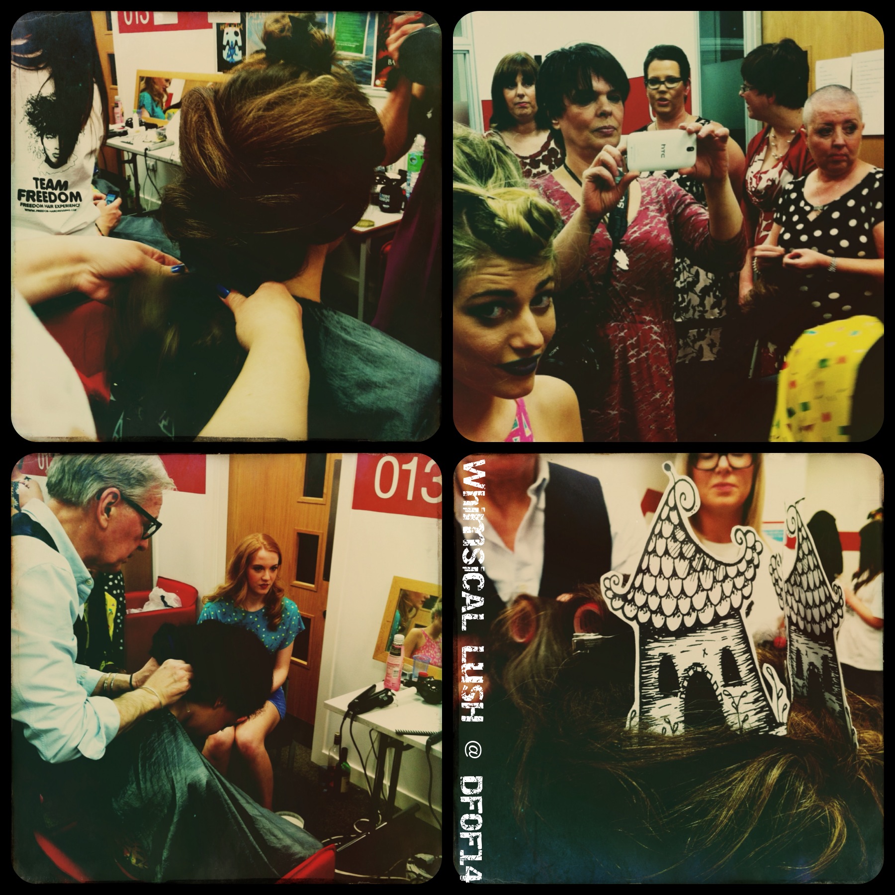 It was side of stage, behind the curtains, and the final section of Dundee’s Face of Freedom 2014 (#DFOF14 for the tweeters and Instagrammers) was well under way! The models had taken to coming off stage and pelting across to the back corner as fast as they could for outfit changes. They did really well and were looking amazing in Hayley’s creations. The little houses, well.. they did good for the most part but some not so much! For every dress that was pulled off over hair another house took its chance.. they were flying through the air! Irving was chasing after them before their next stage walk to put more buildings in place and hairspray more hair into place.