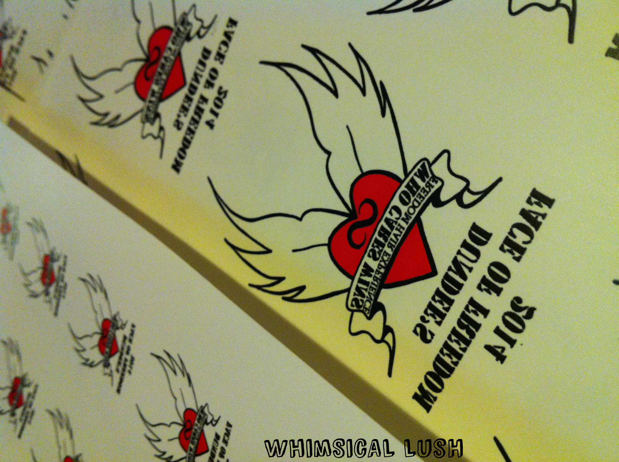 Then there it was, a definite light bulb moment! I could actually visualise the bulb above his head when he said the word ‘tattoos’. Tattoos? Yes tattoos. Everyone taking part in the show shall get tattoos of the ‘Who Cares Wins’ logo. The models shall all get large ones on their arms and everyone else shall have smaller ones that shall go on their wrists as cool backstage passes. Temporary tattoos of course! Fantastic idea. We were both delighted with it and within minutes he had ordered materials required for me to make them. The instant joys of modern technology!