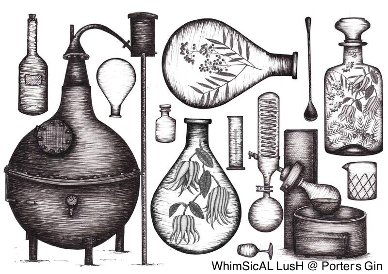 Armed with all of this information I sat down to draw. I imagined that I was mixing an inky version of Porter’s Gin on my paper when I began combining images of buddah’s hand fruits with pink peppercorns and juniper berries in various illustrated versions of glass bottles and flasks. I also set to creating the whole gin making process on paper. Images of pot stills, rotovaps and mixing glasses began to appear on my pages alongside cocktail making tools as my mind journeyed on to the final drink that Porter’s Gin would be a part of in someone’s hand.