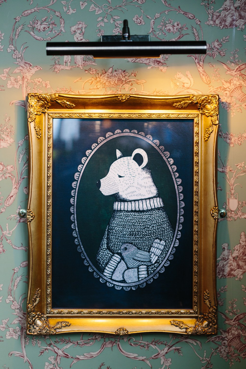 The window ties in heavily with the story of Bird and Bear. Harold freed Pip from her cage, and her friends too, so the bird cages are those from the story. You will spot too, that every single cage is empty. The birds have all been freed by Harold and can be found dotted around the bar, in the beautiful vintage prints and also in the big hand painted mural in one of the cosiest corners. Spot Pip cosied up safe in Harold’s arms, joined by cheeky little Worm and Rita. If you look very carefully you may even spot Bob. He’s off exploring.