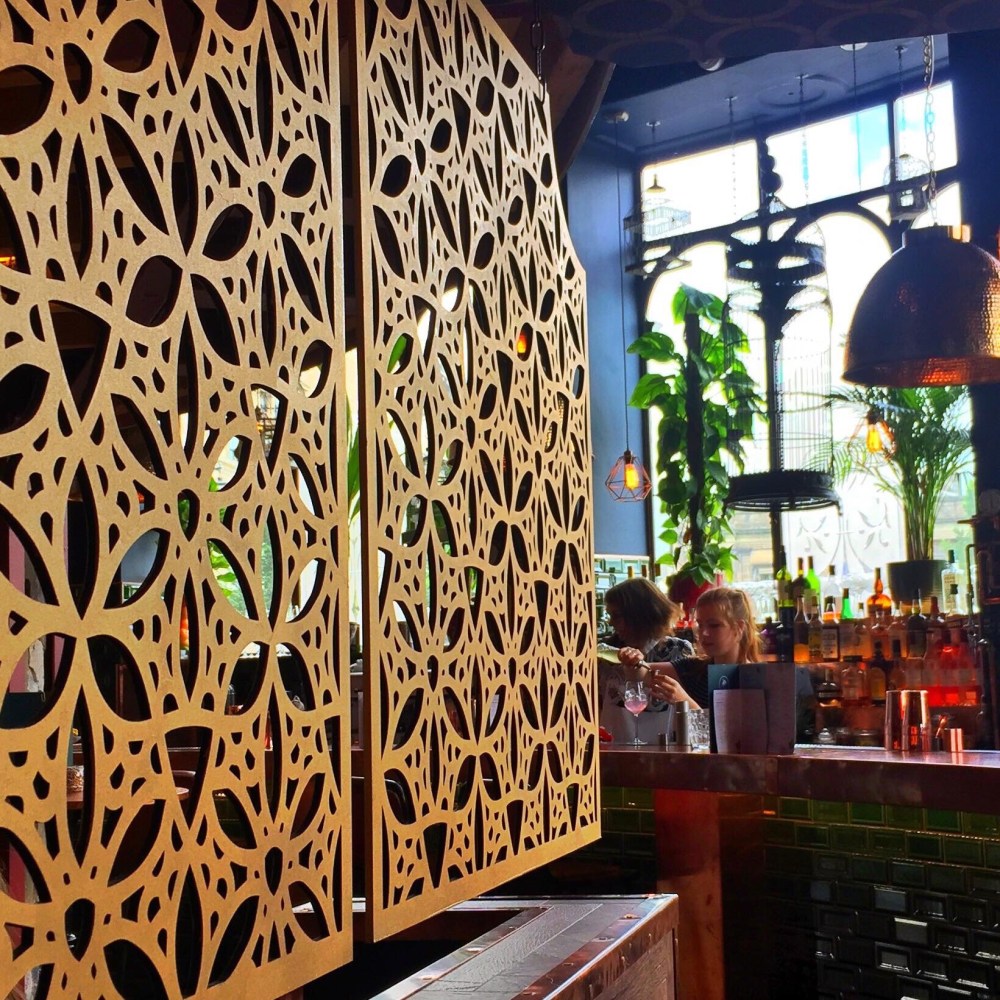 Detailed gold hanging dividers catch the eye and create cosy corners and nooks throughout the upstairs and downstairs spaces. I enjoy creating repeating patterns within my illustration work and was delighted to have the opportunity to use that element of my work in the bar.