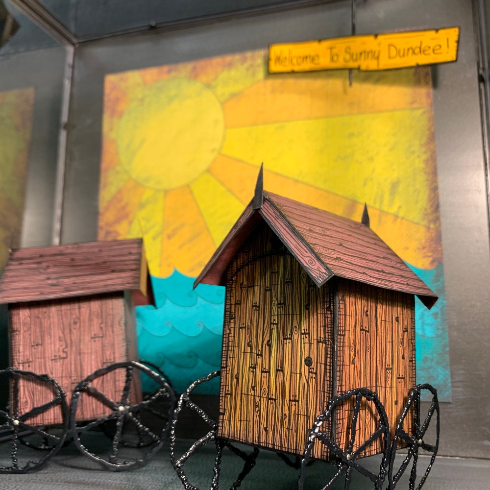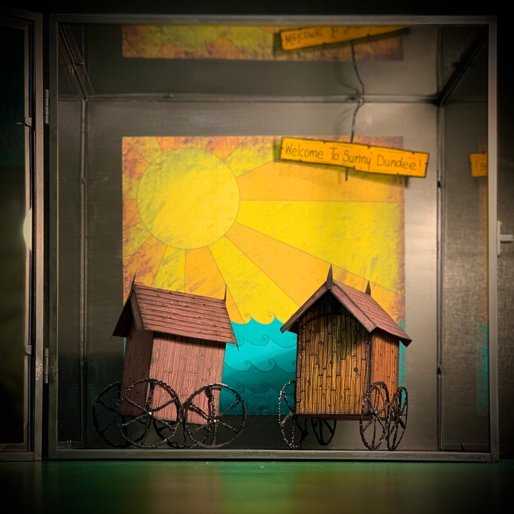 I wanted to create a fun scene with a 50’s style poster backdrop that advertises Sunny Dundee as the place to holiday – throughout the ages – with the contrasting Victorian bathing boxes in the foreground. The diorama contains modern day elements too – including the clever Dundee branding that came about in 2018 to promote our city as the perfect tourist destination #SunnyDundee.