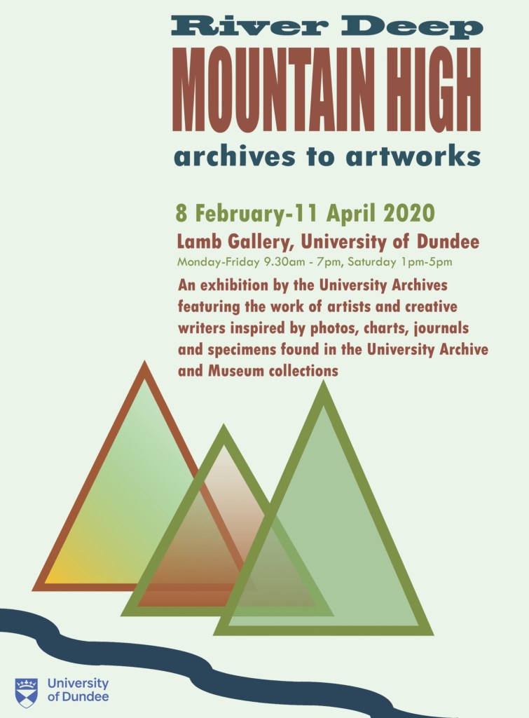 An exhibition to mark the Year of Coast and Water curated by Archive Services at the University of Dundee. Artists and creative writers were invited to respond to the University’s rich collections on the themes of rivers, seas, coasts and mountains. Original photographs, journals, plans and specimens relating to whaling, the River Tay, the natural world and mountaineering have inspired jewellery, artwork, sculpture, poetry and much more.