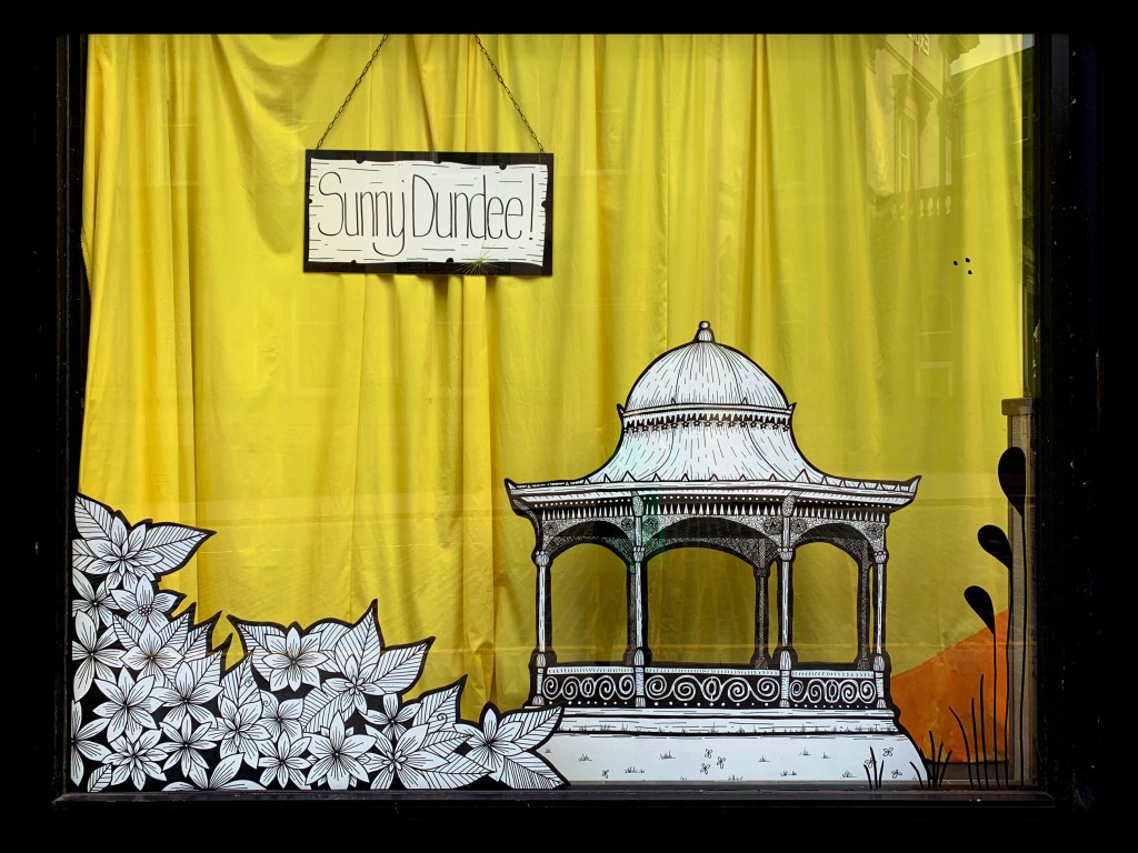 The sunny backdrop and the wooden sign hang as the ‘title’ of my window encouraging the #sunnydundee. Also linking into the bright retro style sunshine painted onto a hanging fabric backdrop. The sunbeams of the backdrop echoe the sunbeams that make up the gardens along Perth Road, which also house a mini Bandstand.