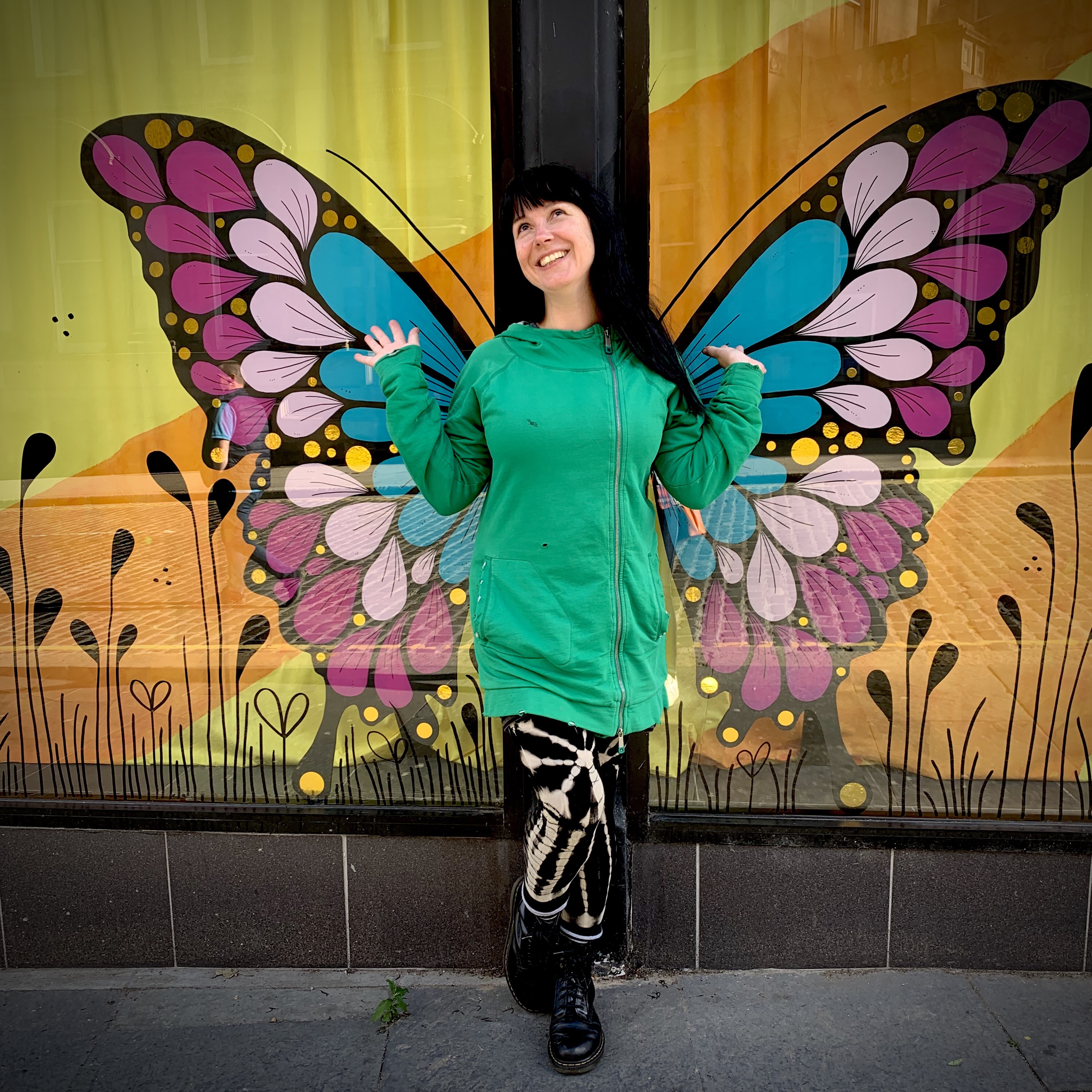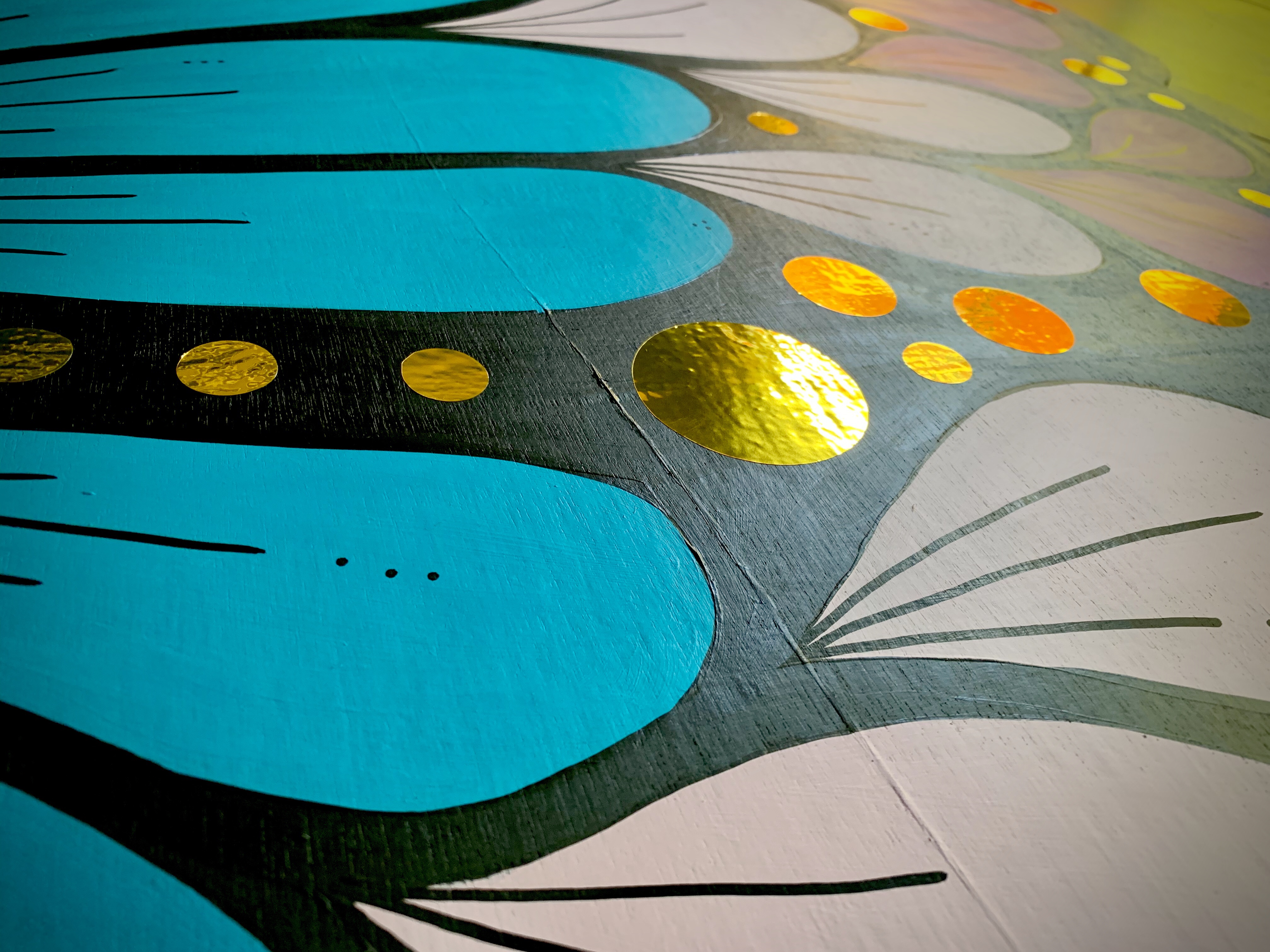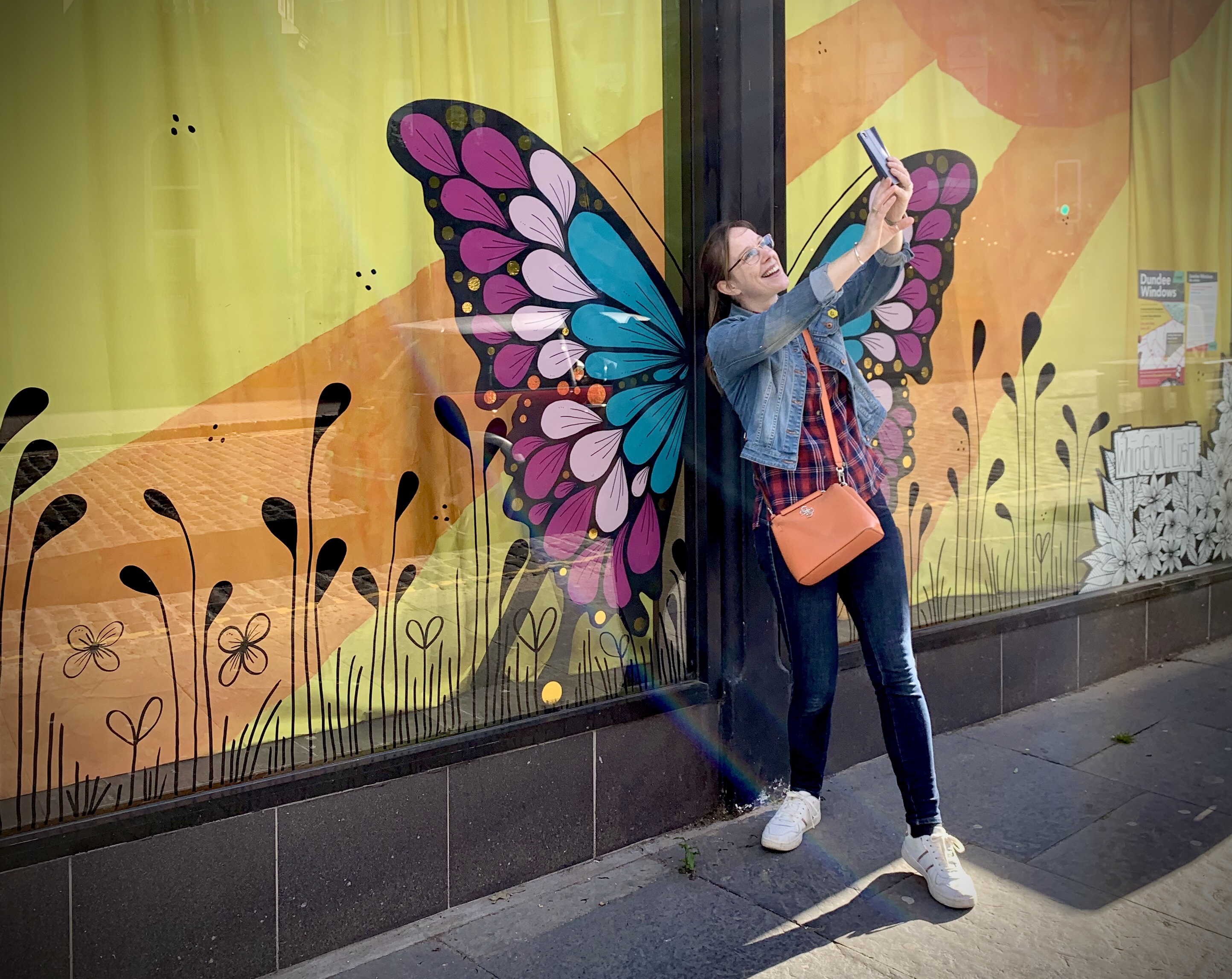 Here is my original submission. The main part of the brief was to create a window display that was interactive, Dundee themed, bright and colourful. It was tricky to design as at this point we had no idea how big, or what shape our windows were going to be, so it was important to make it a design that could be flexible in how it could be realised. Turns out I had to adapt mine quite significantly in terms of length (it’s almost 9m long and over 3m high), which meant making larger/ longer display pieces. I also had to get my head around working with having two splits in the window – so the solution was bigger butterfly wings incorporating the pillar as the body rather than trying to squeeze in a smaller piece between two posts. In order for the display to be robust enough to last several months in the window without fixtures (were not being able to use fixtures to hang work, which was a part of my original design) I decided to create everything as painted wood cuts rather than the originally planned mix of illustration on paper, wood cut and paint on window so it could be adapted to using props for pieces and the use of scaffold poles to hang backdrop fabric and sign (supplied and installed by the wonderful Sweet Venues). This was all with a pretty tight turnaround time, as these types of projects often are. All things considered I think it worked out well, I’m really happy with the final window installation and really loving watching people interact with it.