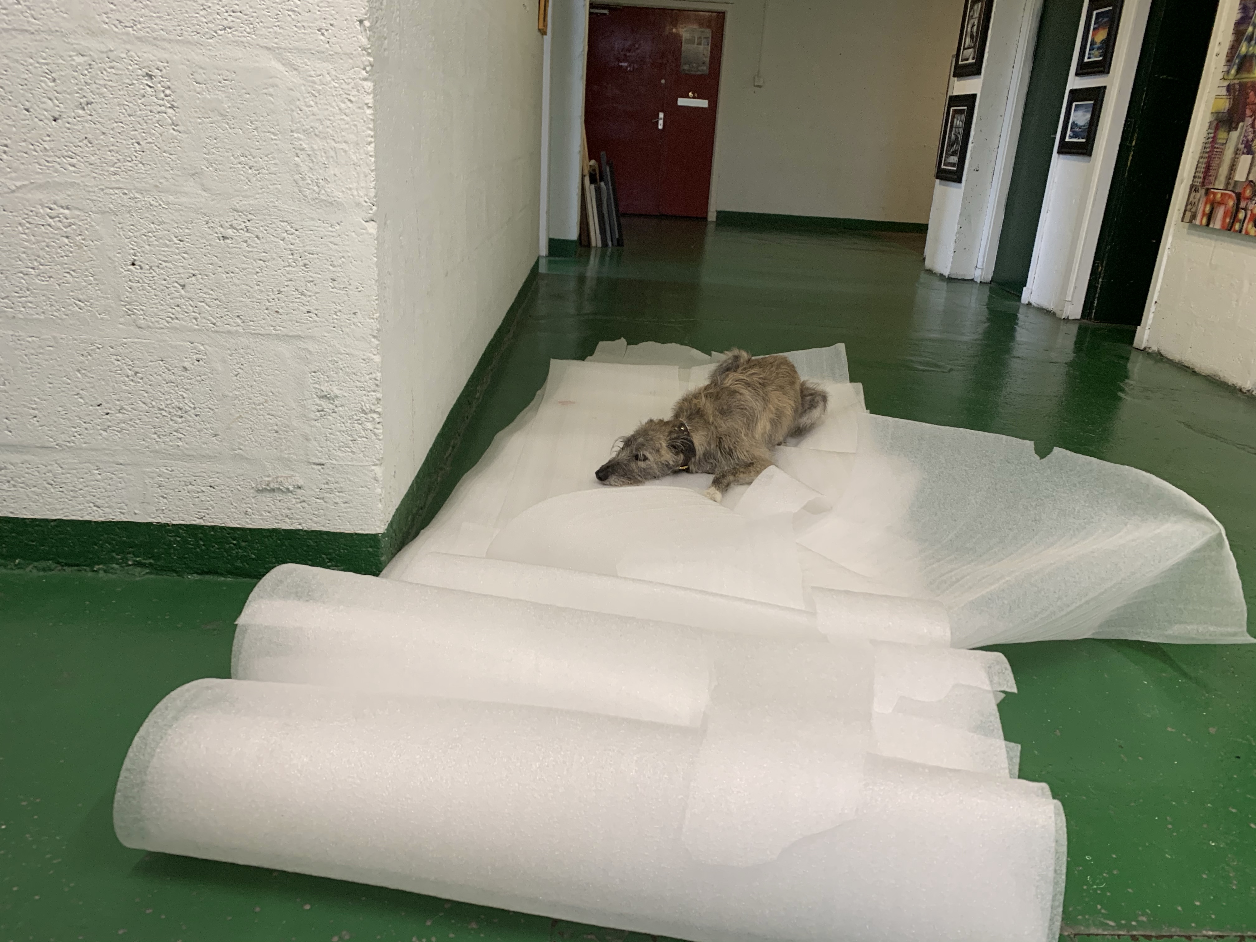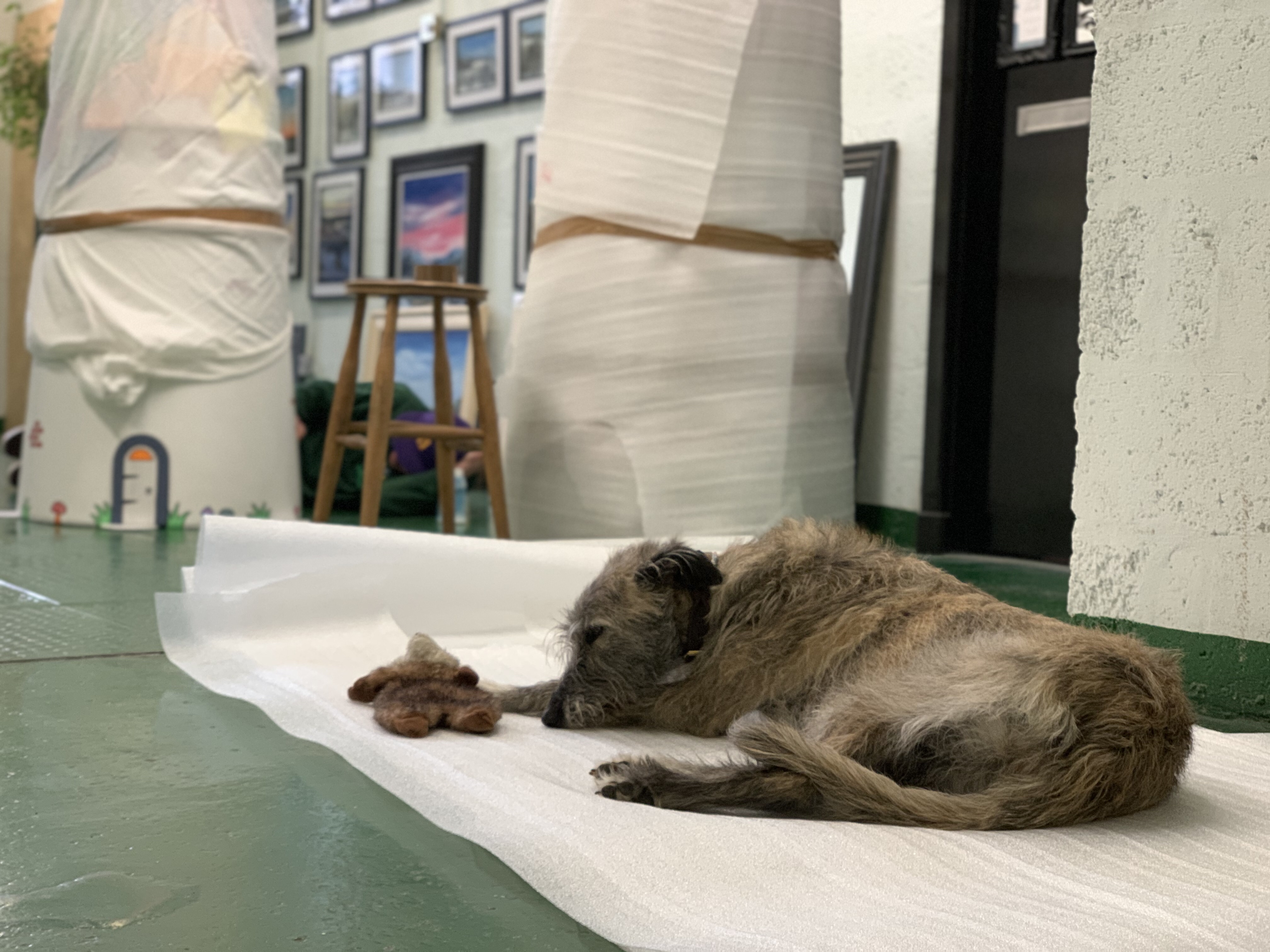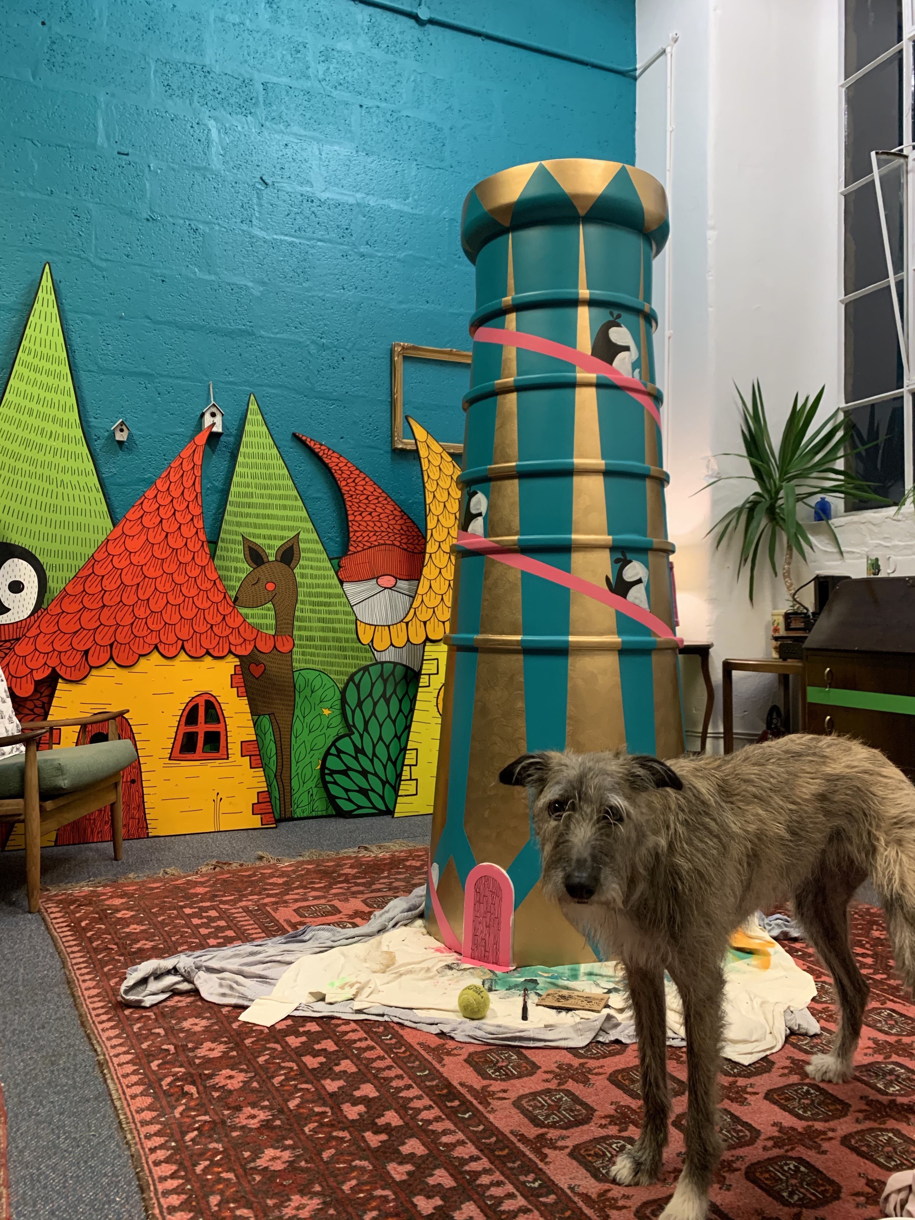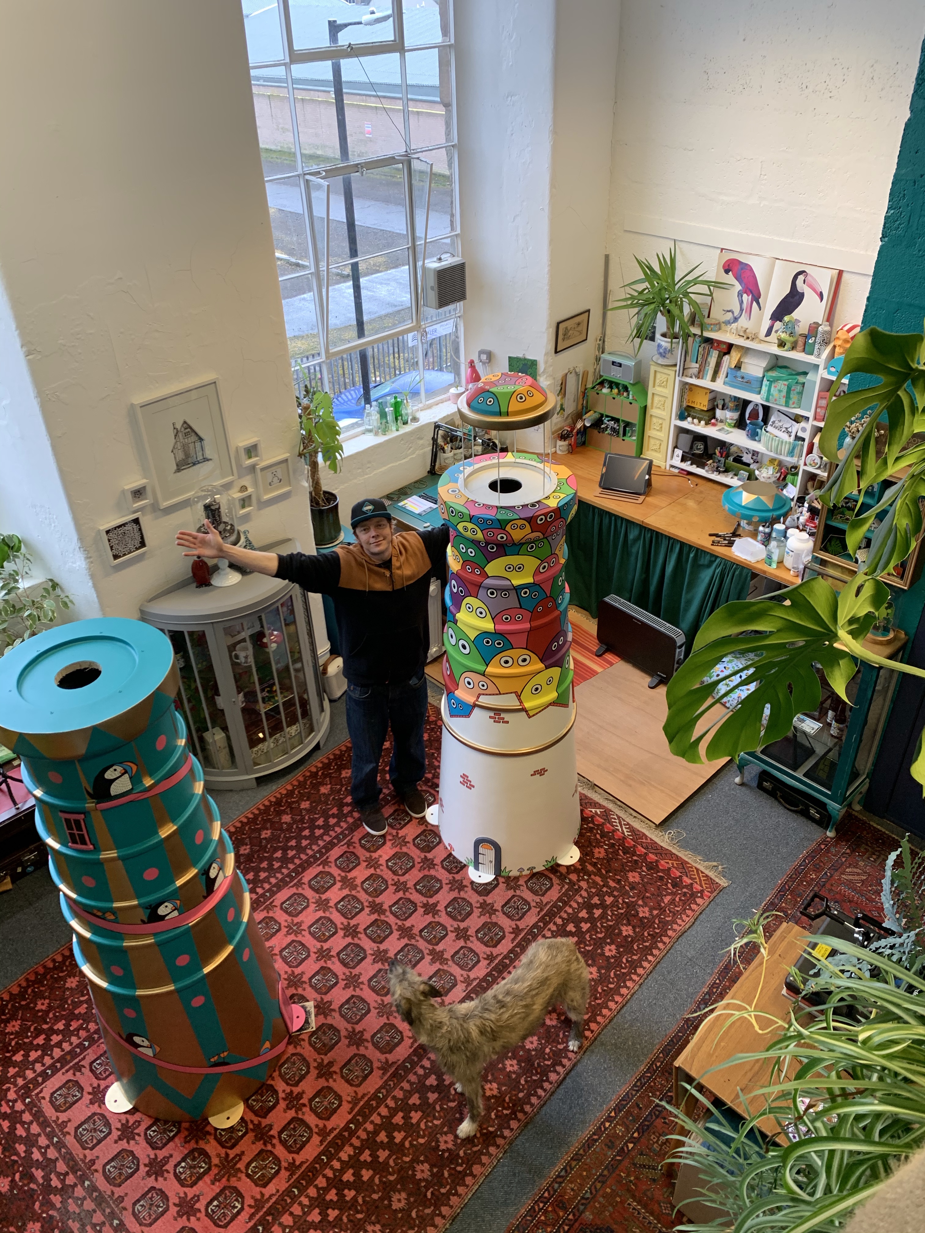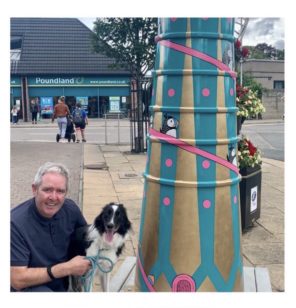… and some behind the scenes pictures too! You’ll spot that I was sharing my studio space with two others. My scruffy wee dog Lupin is not usually far from me and is great company in the studio but not so helpful with wrapping sculptures, he he. She’s also good at telling Blair (Blair McCafferty – Creature Emporium) to stop slacking and get painting too! I love that photo. 😆 He needed somewhere to paint his lighthouse and we always have a laugh working together. You can find his lighthouse in Aberdeen.