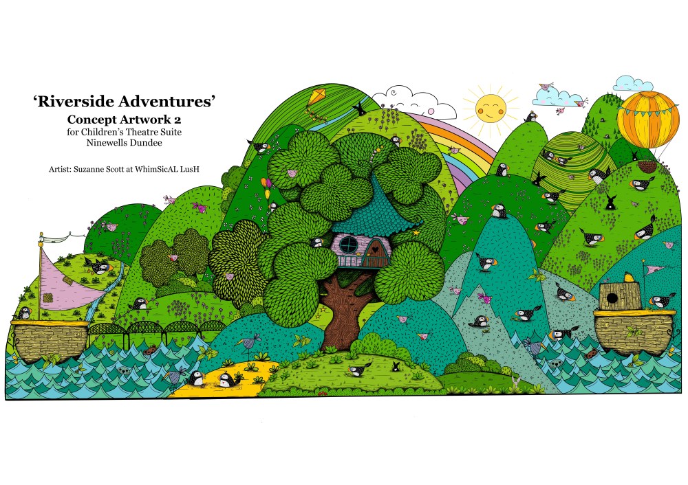 “The artwork created by Suzanne for the Children’s Theatre Suite at Tayside Children’s Hospital is quite exceptional and has transformed the environment into a bright, welcoming, child friendly environment for children and families attending the facility. It provides a wonderful distraction and point of discussion for children who may be somewhat anxious about attending for surgery and reducing such anxiety is so important for their care. The Riverside theme developed by Suzanne encapsulates the history and location of Dundee beautifully and the story and detail within her work is quite astonishing. The finished work is absolutely fabulous and well beyond our expectations when we commissioned Suzanne.”