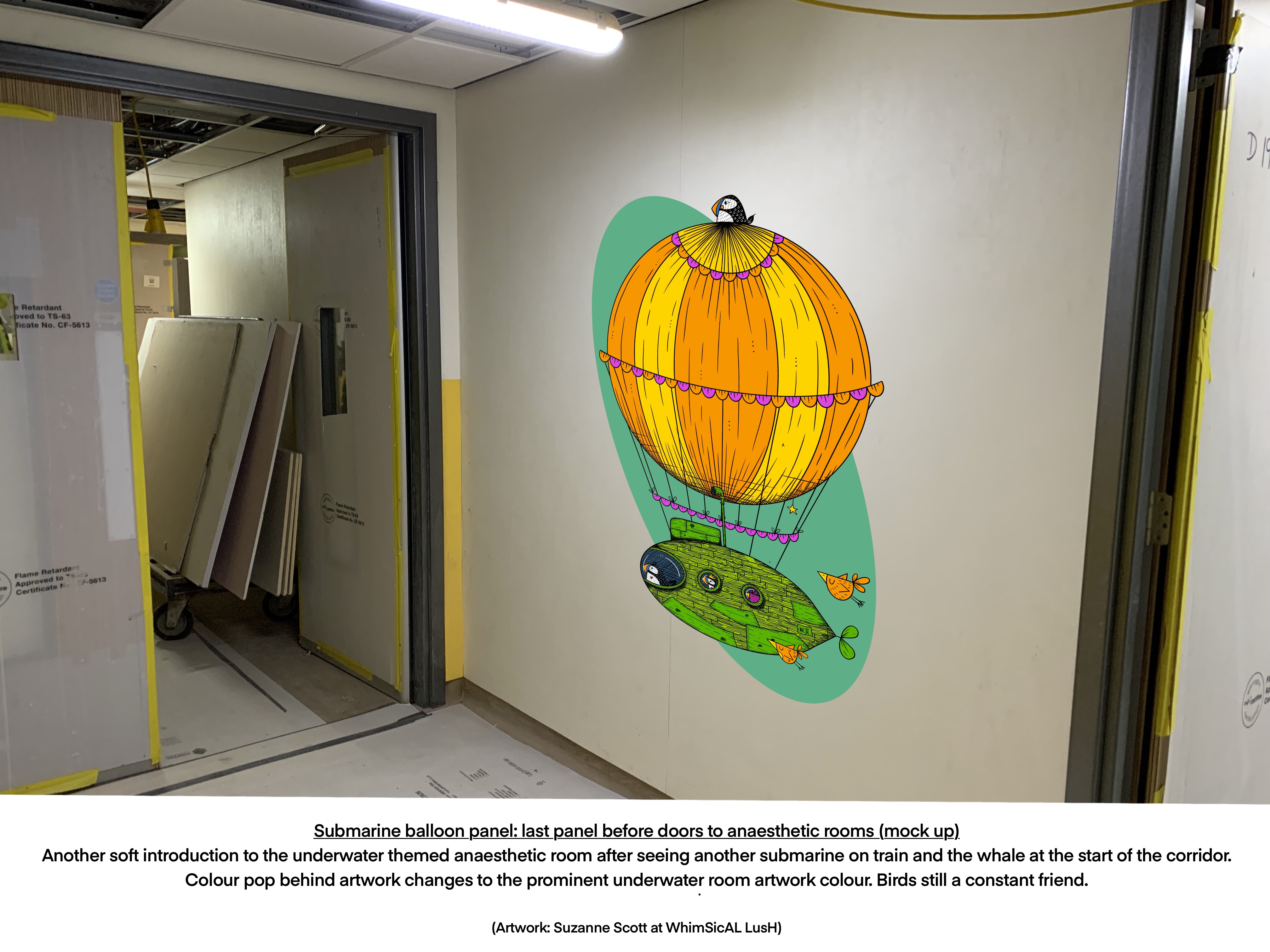 Paula also wrote: “… the incredible artwork, which has really transformed the facility from what would otherwise have been a clinically excellent children’s theatre suite, that is already a million times better than the previous facility, but which Suzanne’s artwork has literally propelled to out-of-this-world levels (and I use the world “literally” carefully) …. “