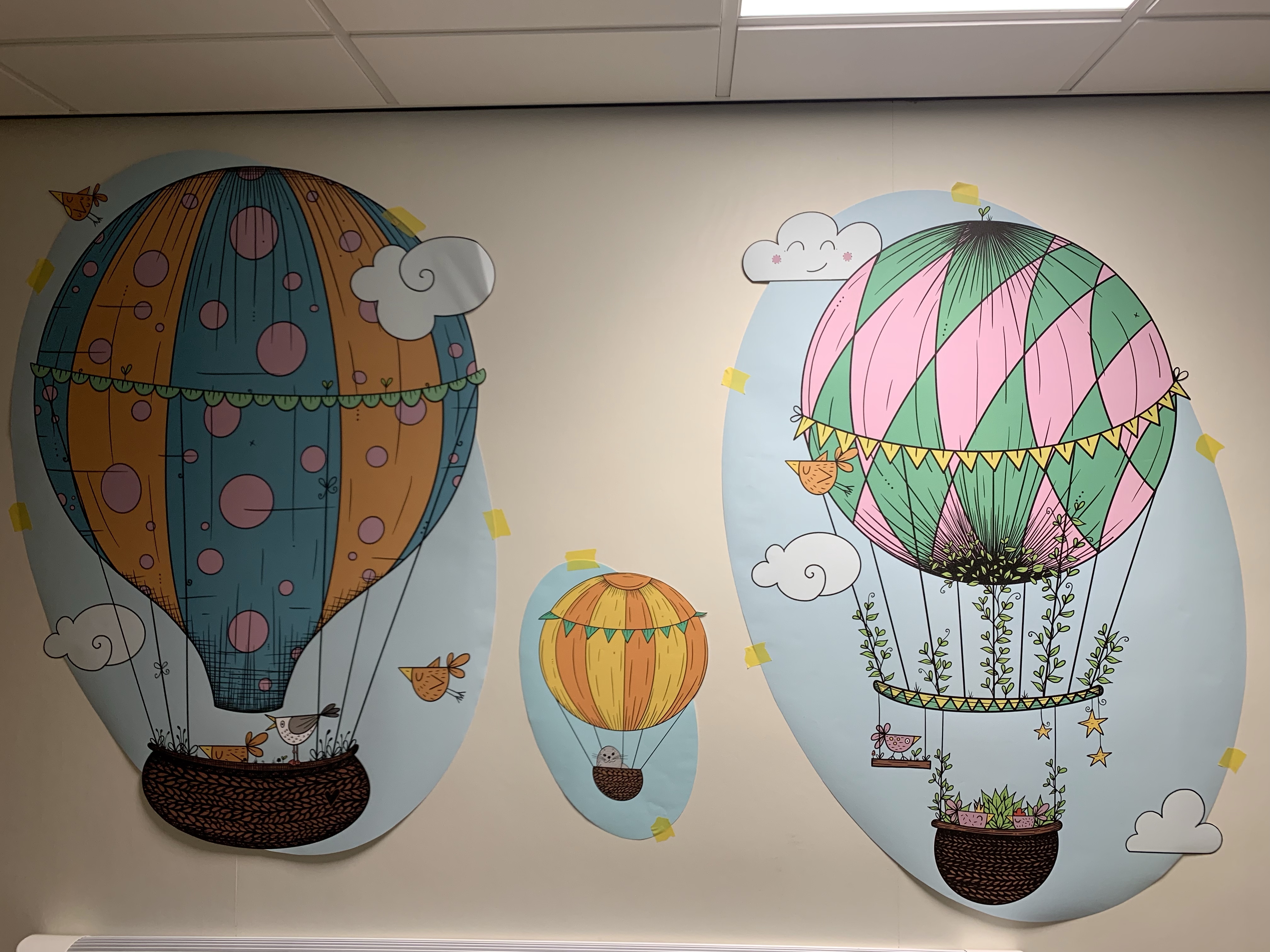 Whist the artwork in the CTS is mainly all about the children and their families and making their experience in hospital easier I couldn’t ignore the fact that there are so many hard working staff who will be working in the suite on a daily basis. These balloons are for them. Calm and with more pastel shades than earlier in the journey, these balloons are opposite the staff room that has a big window looking directly onto this wall. I don’t imagine many children will see them as they will likely still be asleep of very dozey on their way into the ward after theatre.