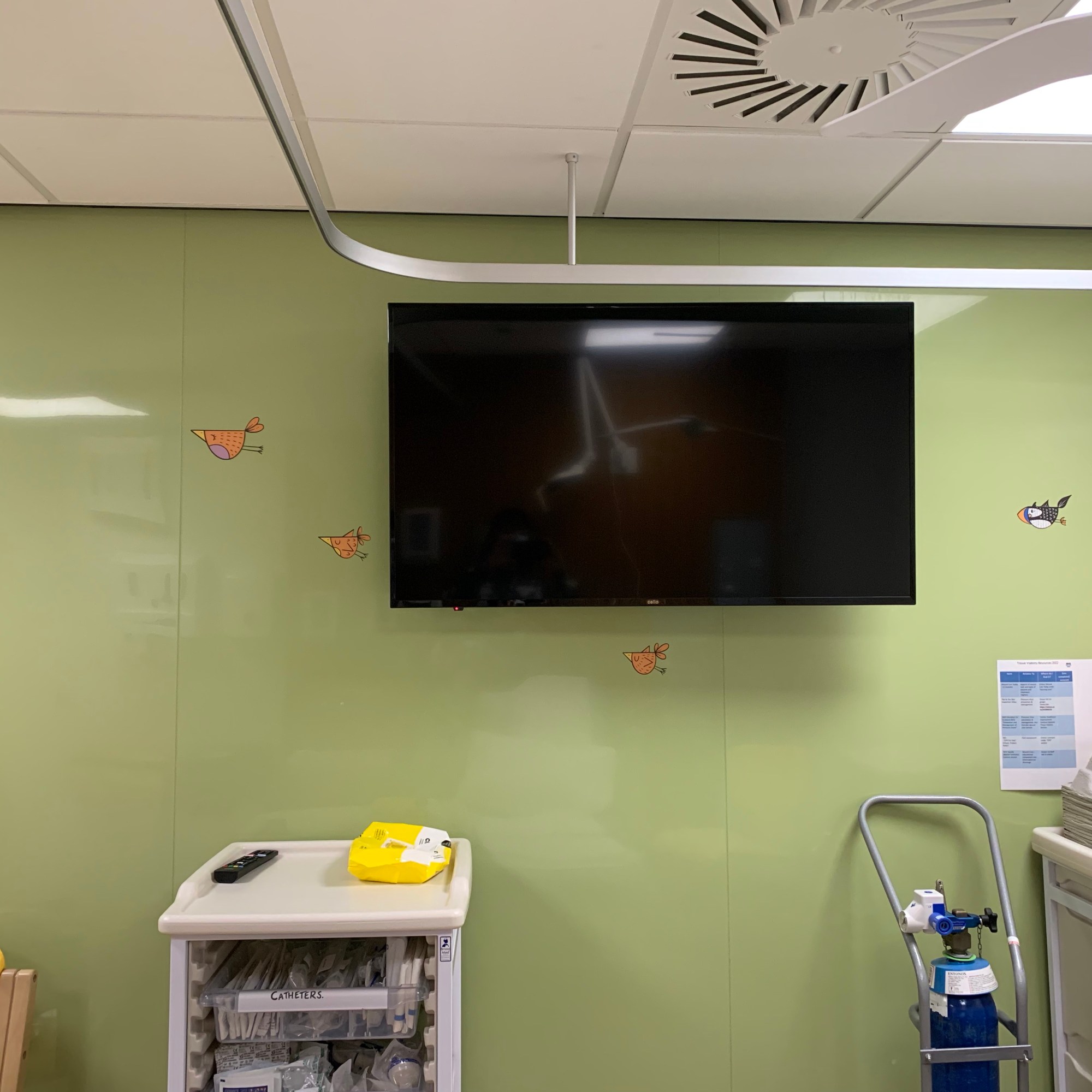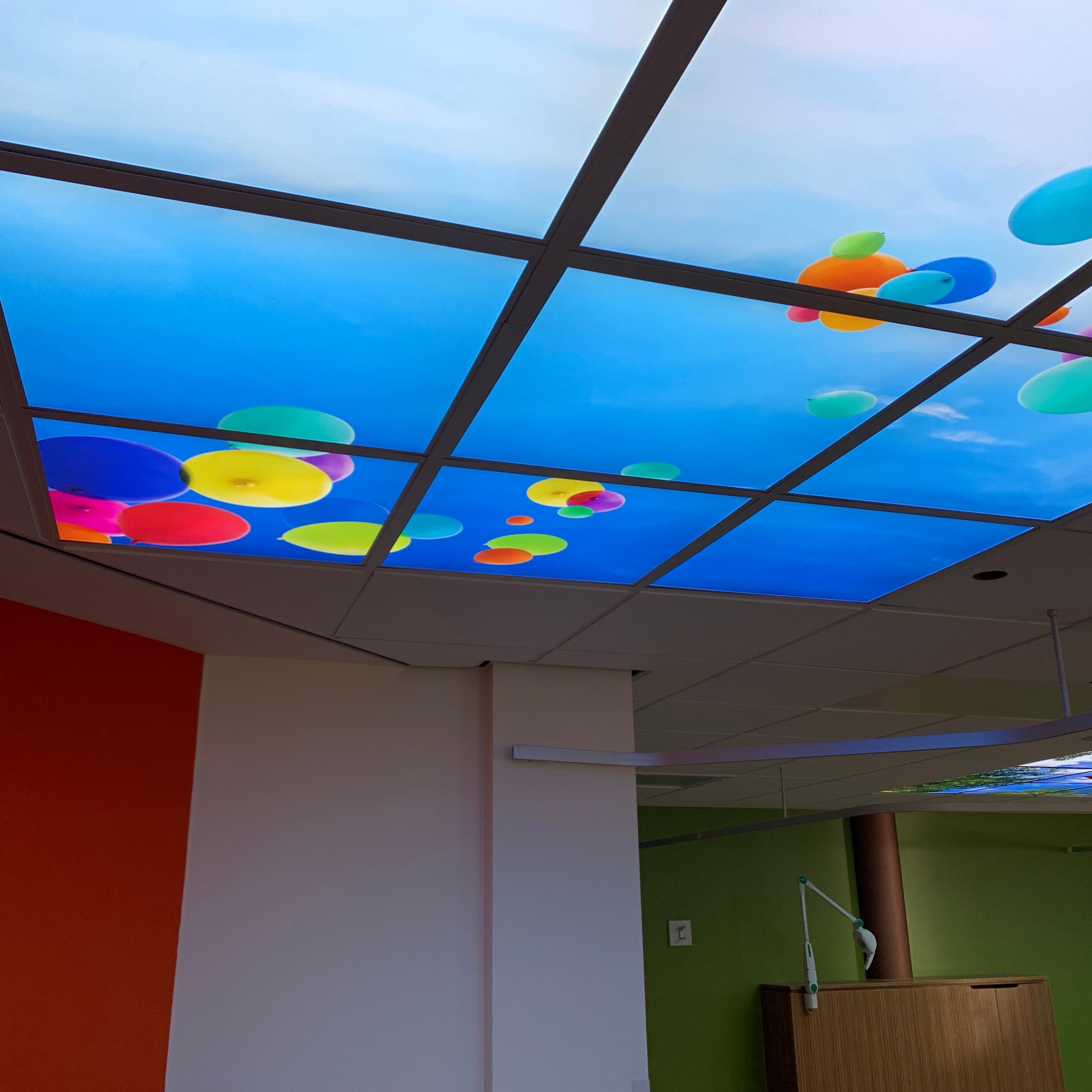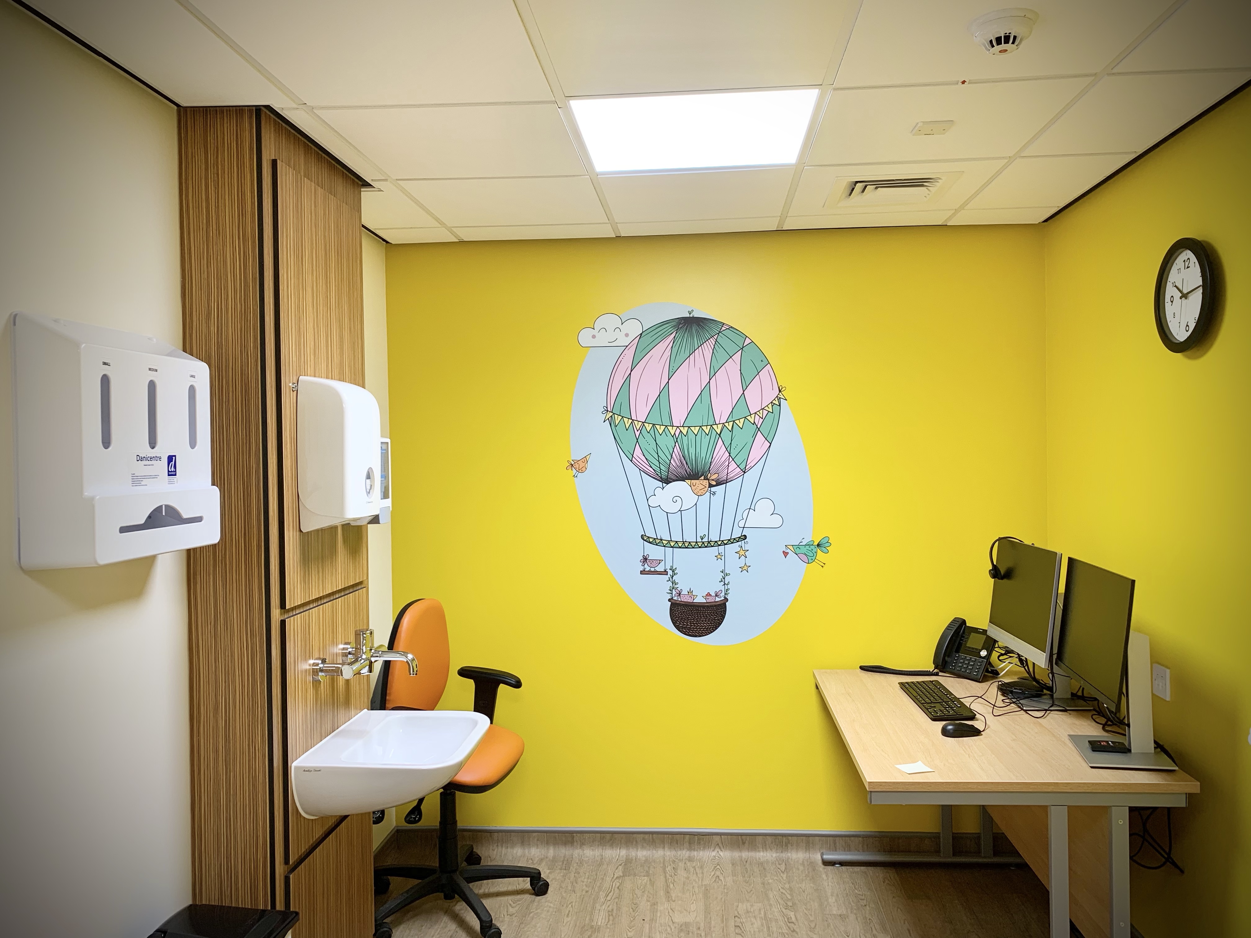 Local children and their families helped choose the artwork theme for the reception/waiting area of the suite, which was then continued through the whole facility. They were also involved in choosing the two themes for the anaesthetic rooms and all the sky panels.