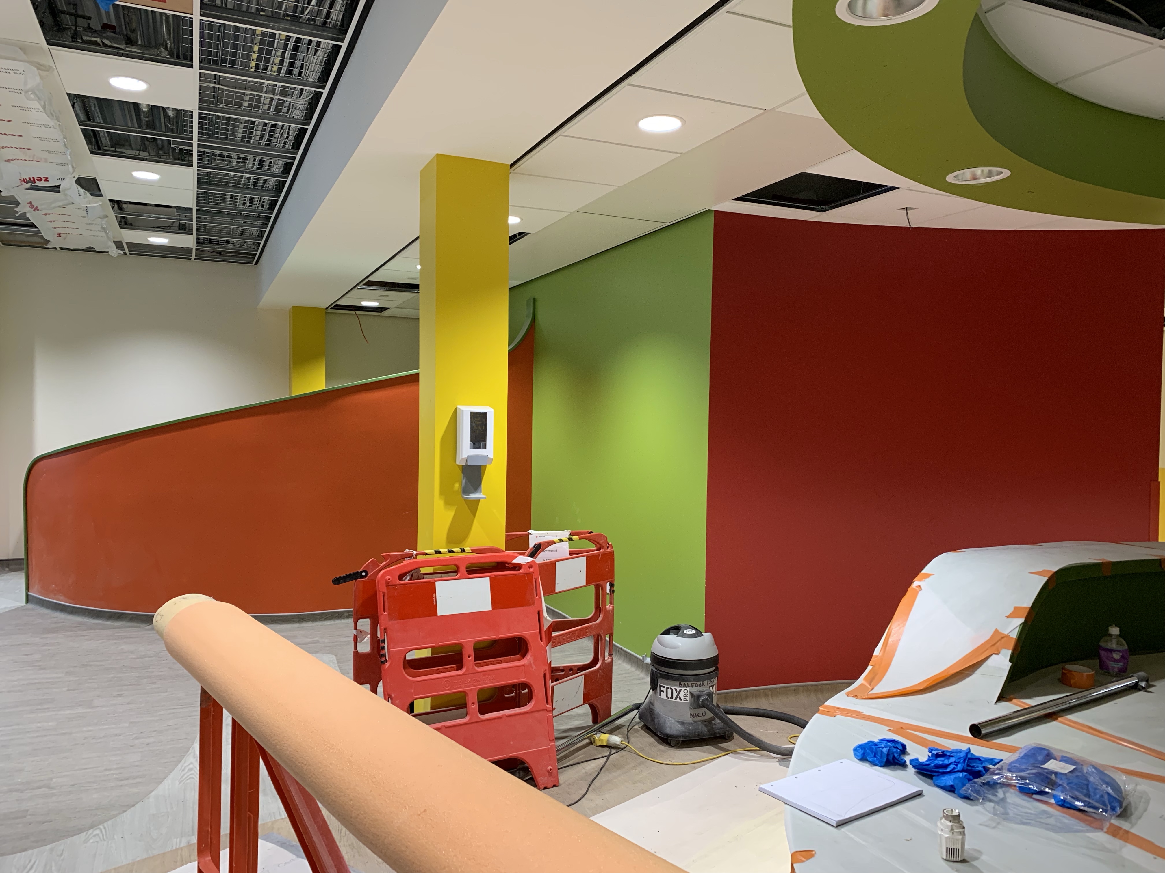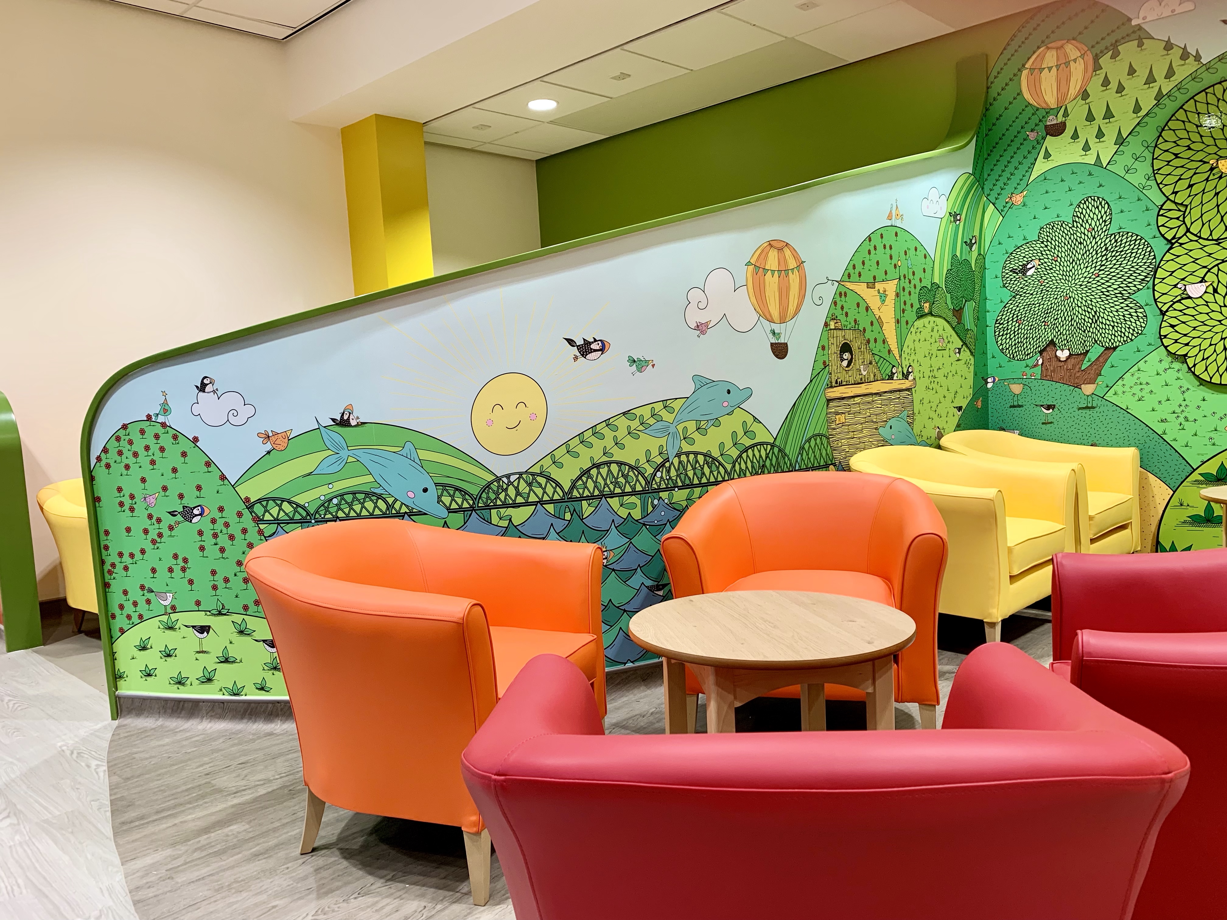 This area is where children and their families will be waiting to go for consultations, treatments and operations. There are lots of things to do, reading, playing… and hopefully spotting lots of new animals, plants and birds in the mural. There will be play and nursing staff there to help everyone too.