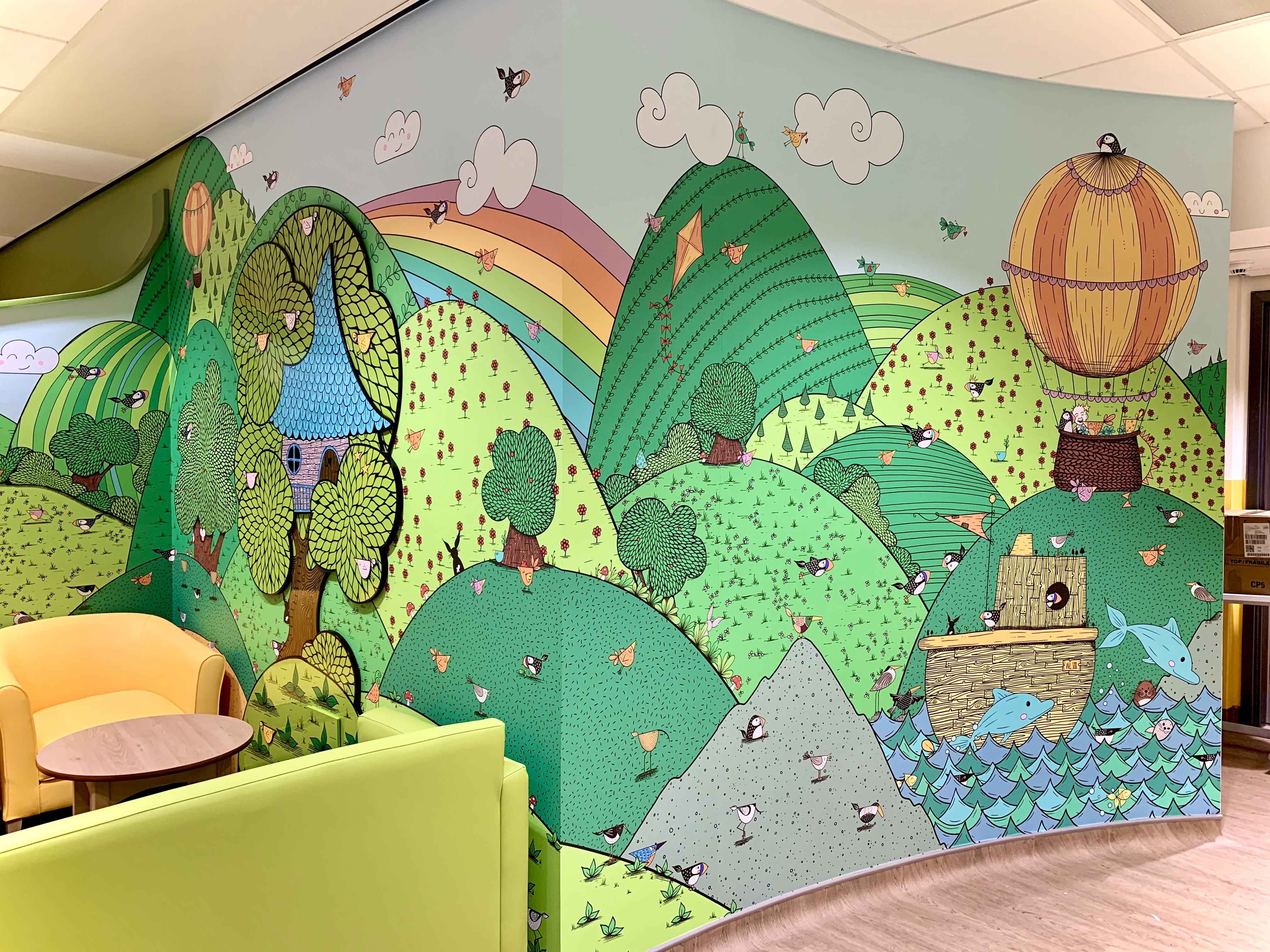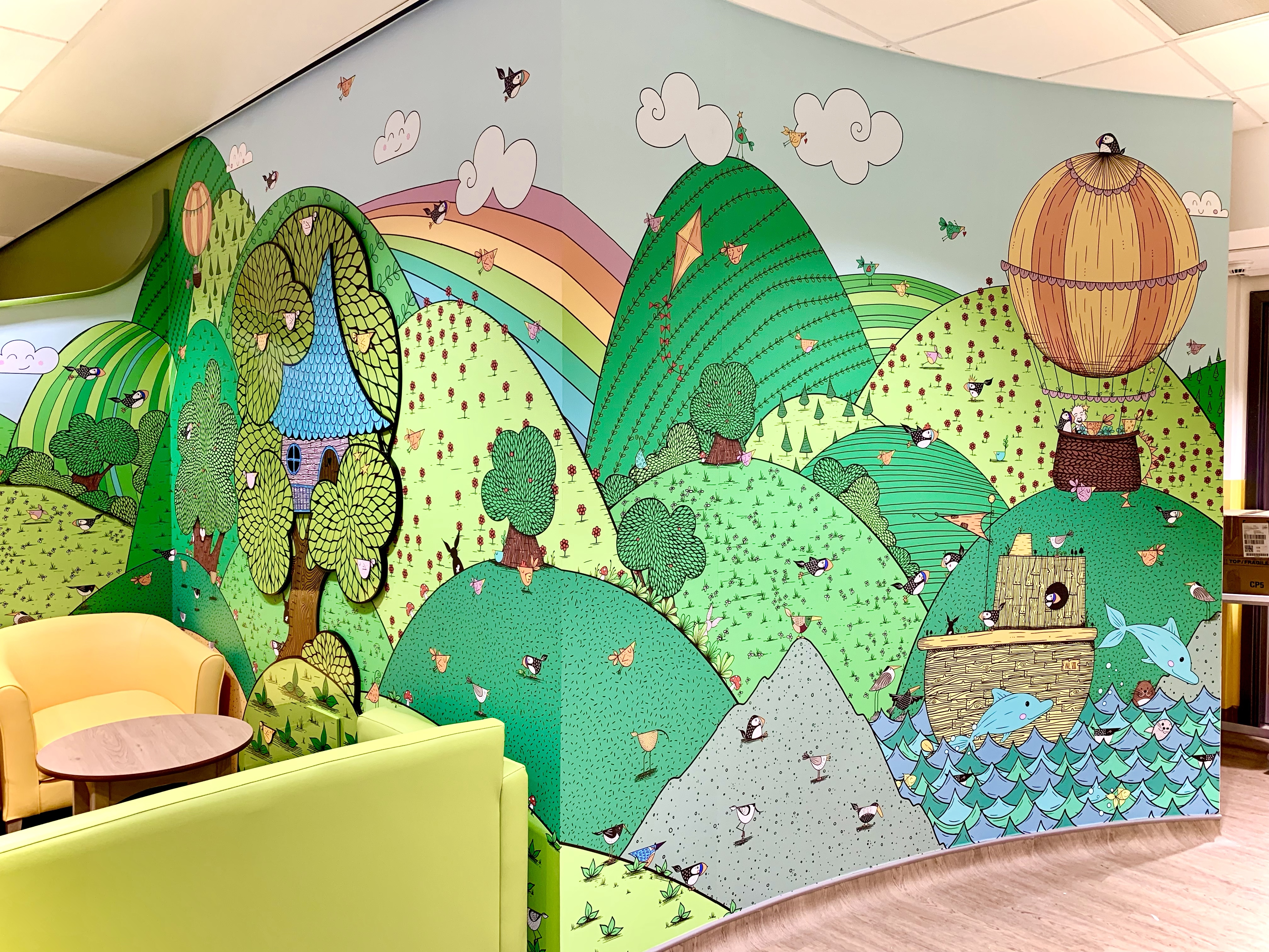 It is so wonderful to be able to announce that the series of giant bespoke murals I created especially for the new Children’s Theatre Suite at Ninewells are now installed, and the first children (and their families) are now being looked after in the suite!