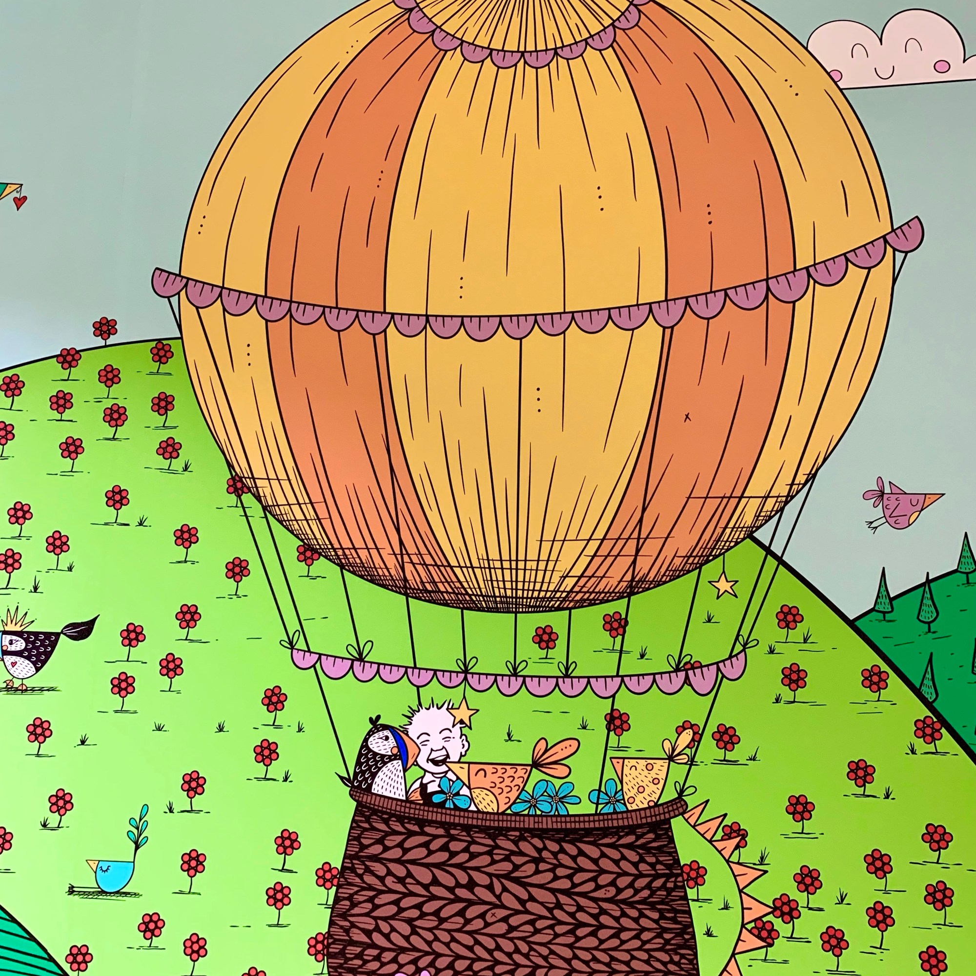These balloons are joining us on our epic journey and they are also helping to transport some important vehicles and passengers too. Spot the famous Tay whale? She’s a nod to Dundee history but in the sweetest way. She’s grabbed hold of a huge bunch of balloons with her big fin and is gently floating along with her wee flying fish friend by her side. Even the clouds are delighted to be with her.