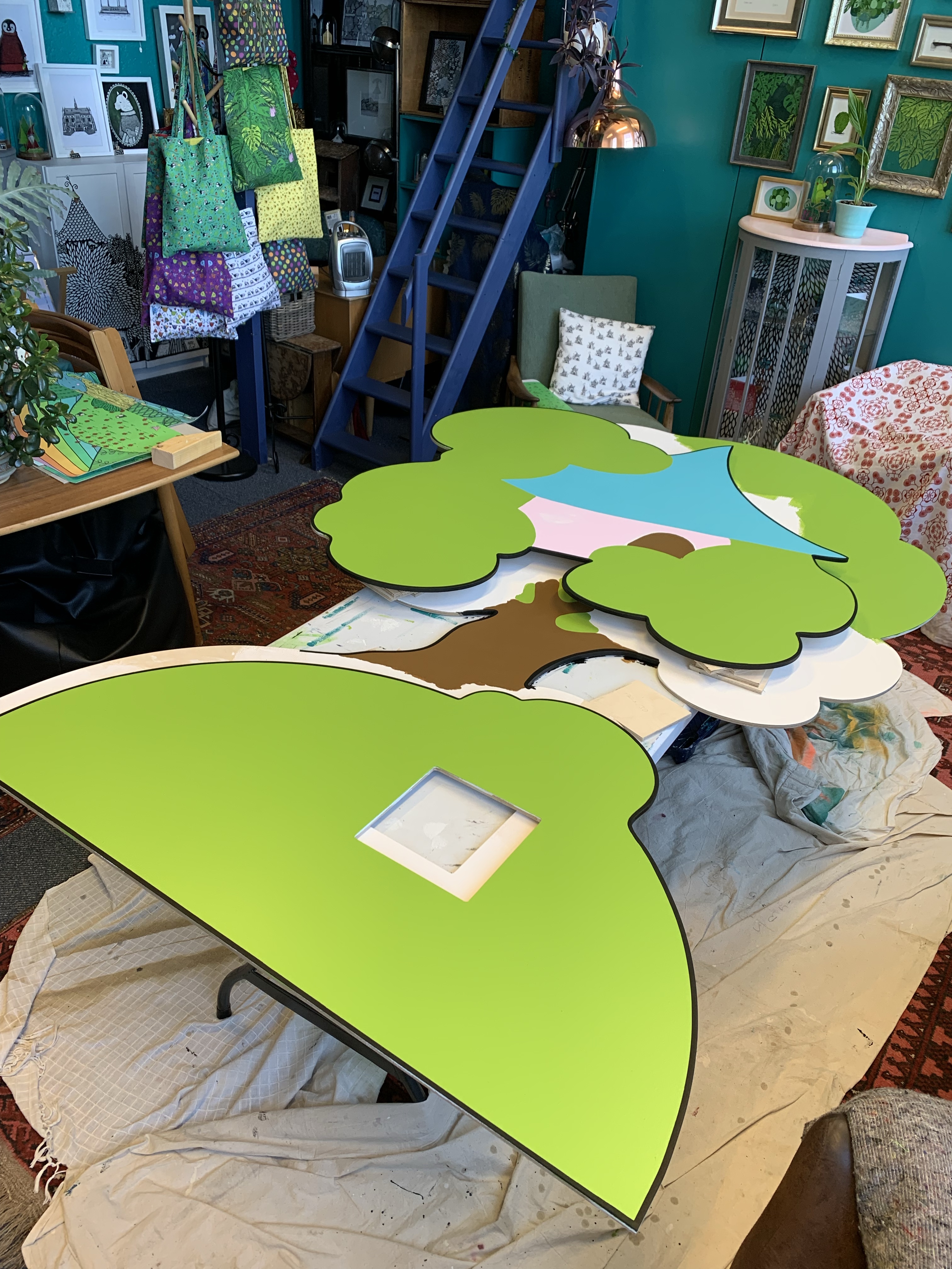 The wooden tree started off as the much more detailed illustration that you can see above. I simplified it along the way to account for size and for infection control too, taking a lot of the curves and angles out of the shape to allow for ease of cleaning. The birds were streamlined from original designs too for the same reasons. Many layers of anti microbial lacquer were then applied, giving it its luxurious (hospital friendly) gloss finish.