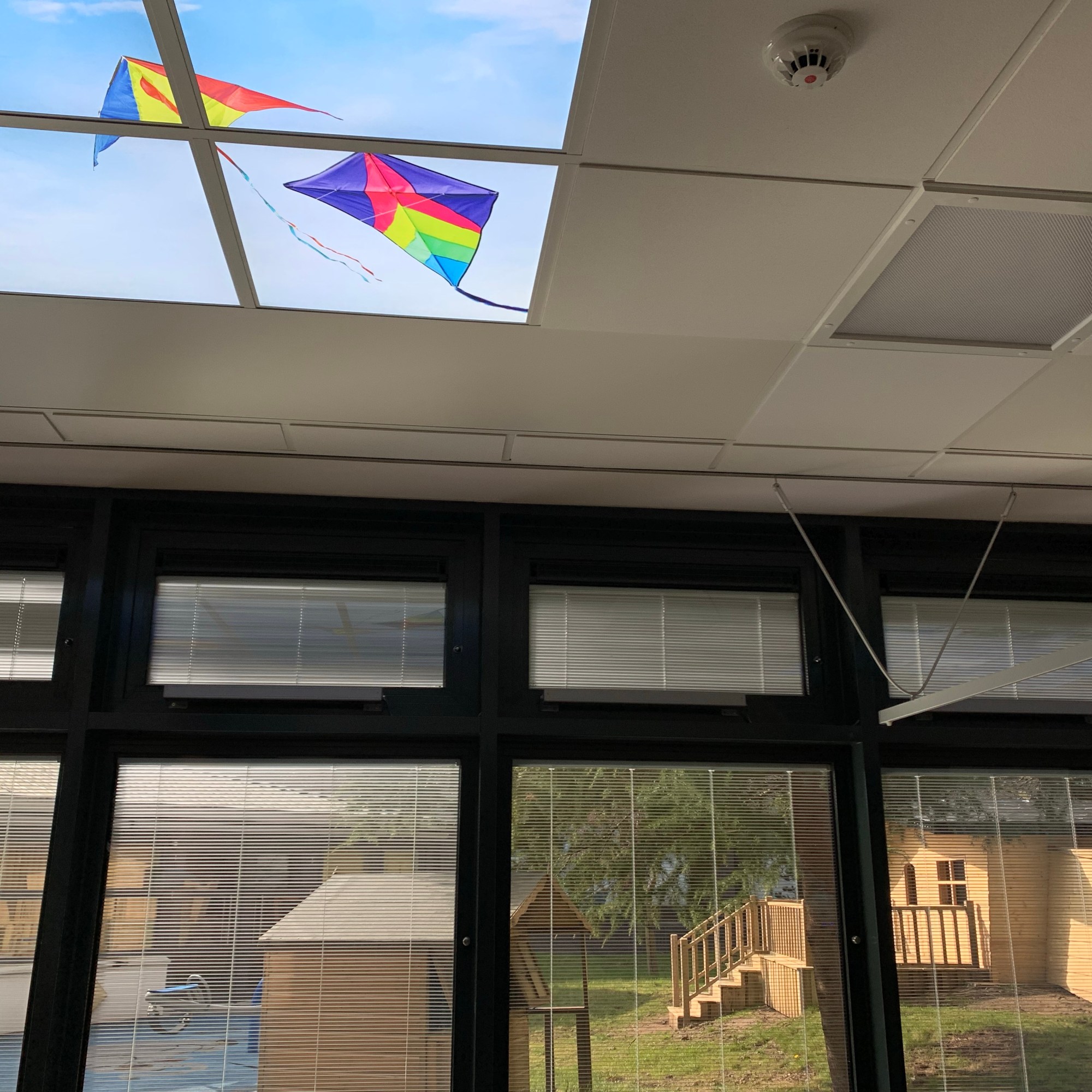 The design includes a selection of bright illuminated sky panels in the ceilings, displayed throughout the unit. Looking upwards, images of sky, clouds, balloons, kites, wildlife are visible above. These panels were selected by children in the hubs established for key workers’ children during the Covid lockdown in 2020. Suzanne has adapted and added and linked to these quite beautifully. A major piece of her work adorns the front reception area. Her ‘Riverside Adventures’ was selected as a theme for the front end reception space and was chosen by staff, children and families in an online voting and selection process.