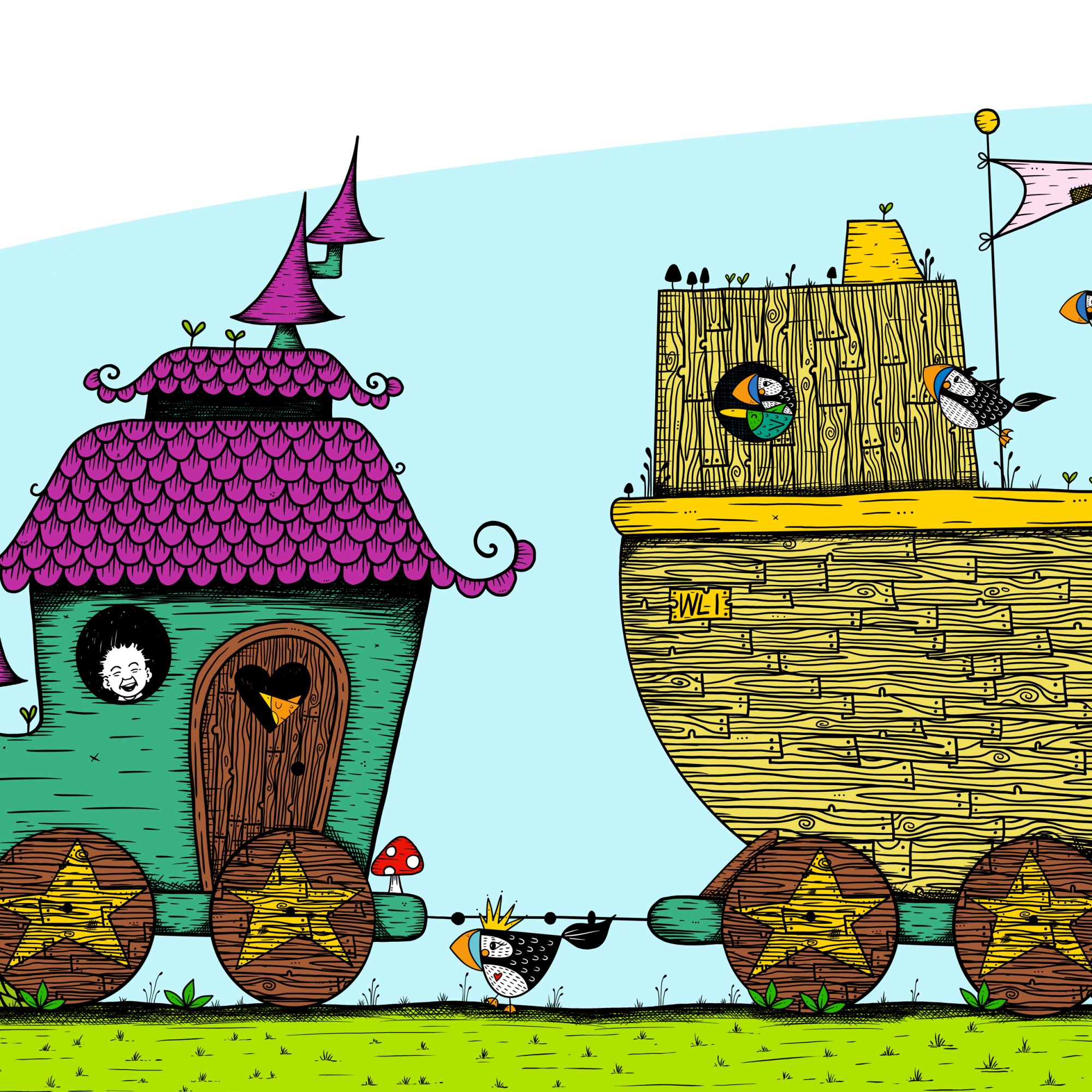 The train is on its journey from the waiting area to the anaesthetic rooms carrying various cargos that are familiar from the waiting area (house that echoes the treehouse, boat, tree, birds) and also introducing elements that you are about to meet (rocket in space themed room, submarine in underwater themed room). The birds remain a constant ‘friend’ throughout the journey.