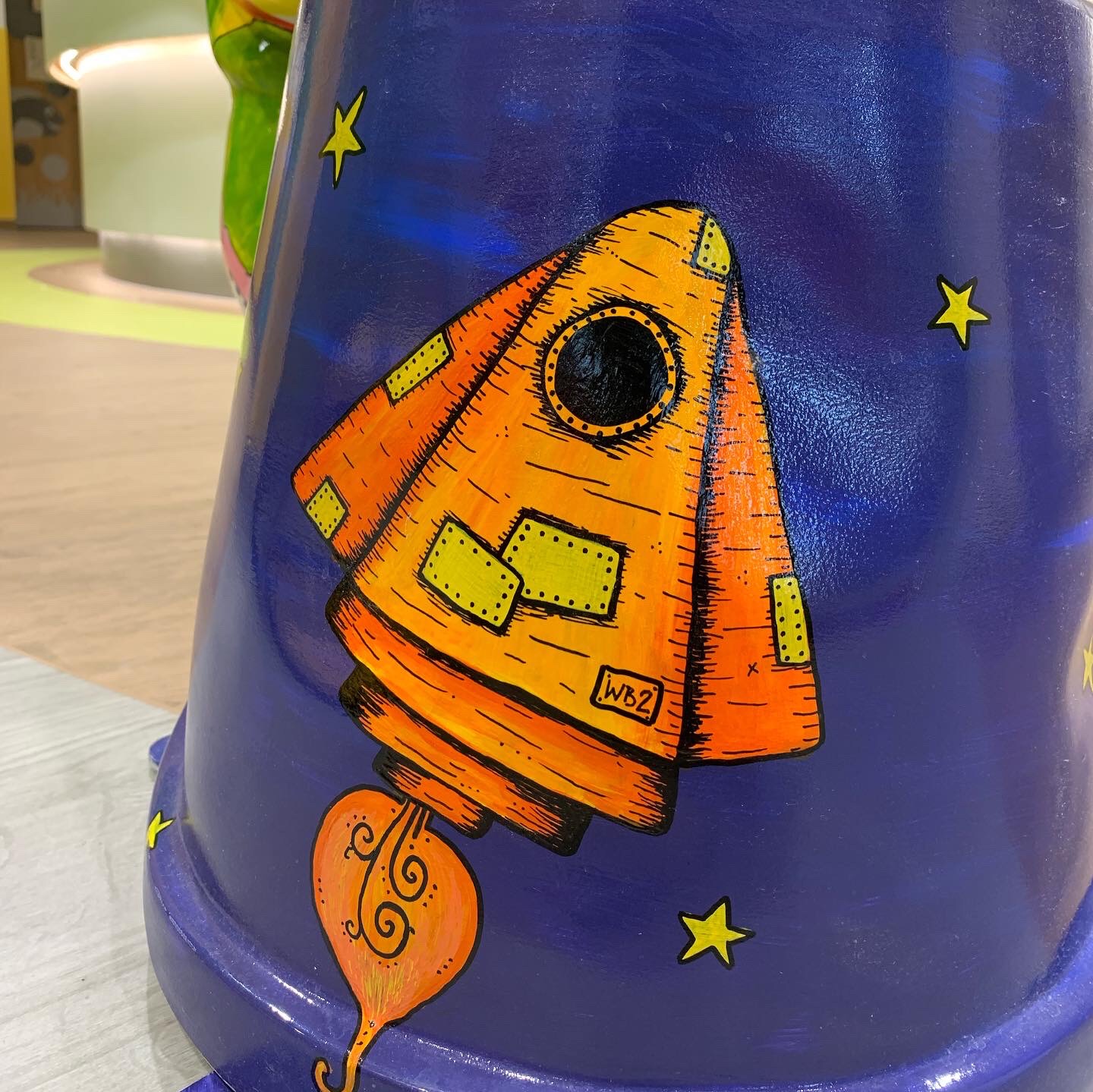 Also being carried along through the clouds is a space rocket! It’s being floated along with us as we all travel towards the anaesthetic rooms at the end. This rocket has its own story to tell us very soon.