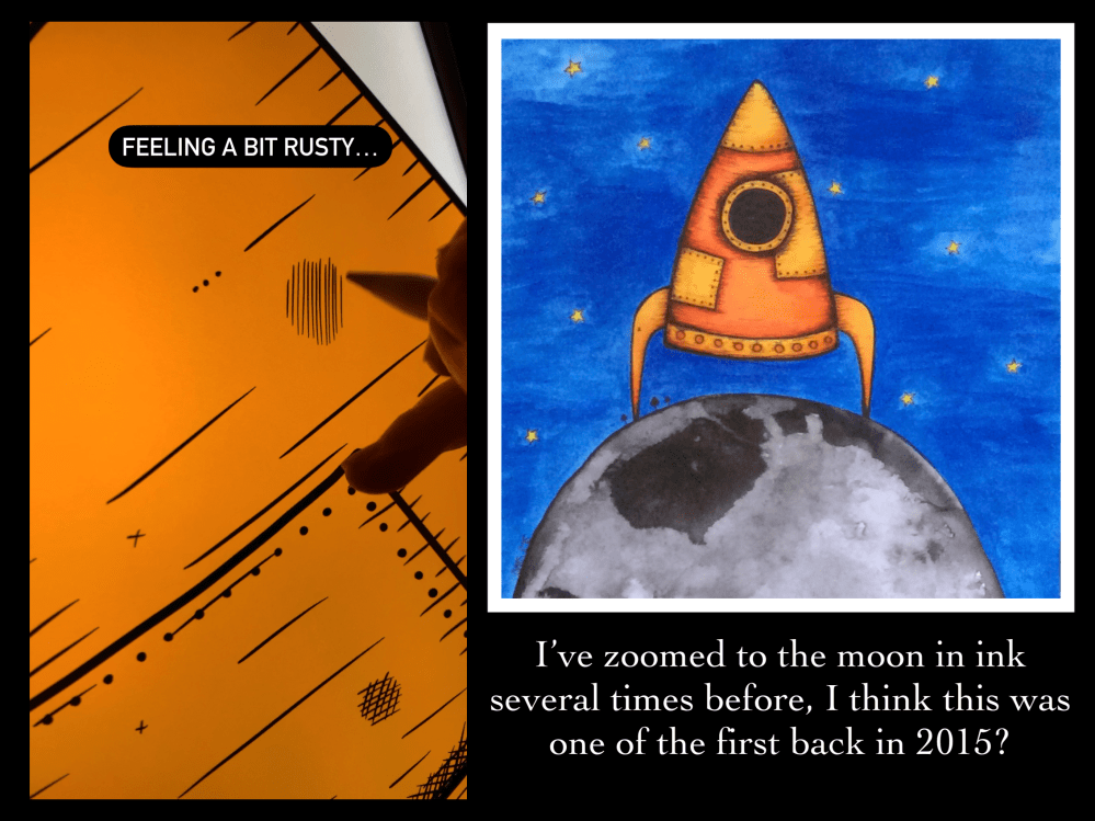 Orange rockets have popped up in my work a few times and I love drawing all things space so it was a joy to create. You will notice our bird pals have made it up into space too… courtesy of their specially designed space state of the art bubble suits.