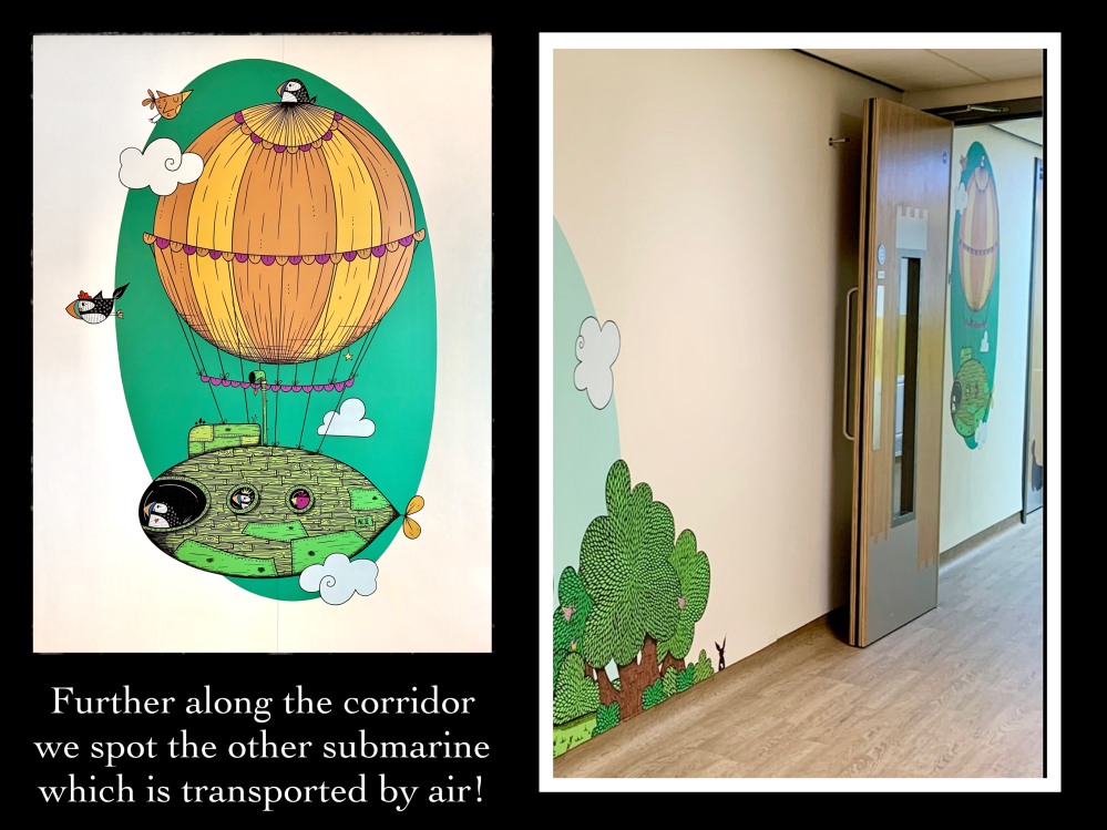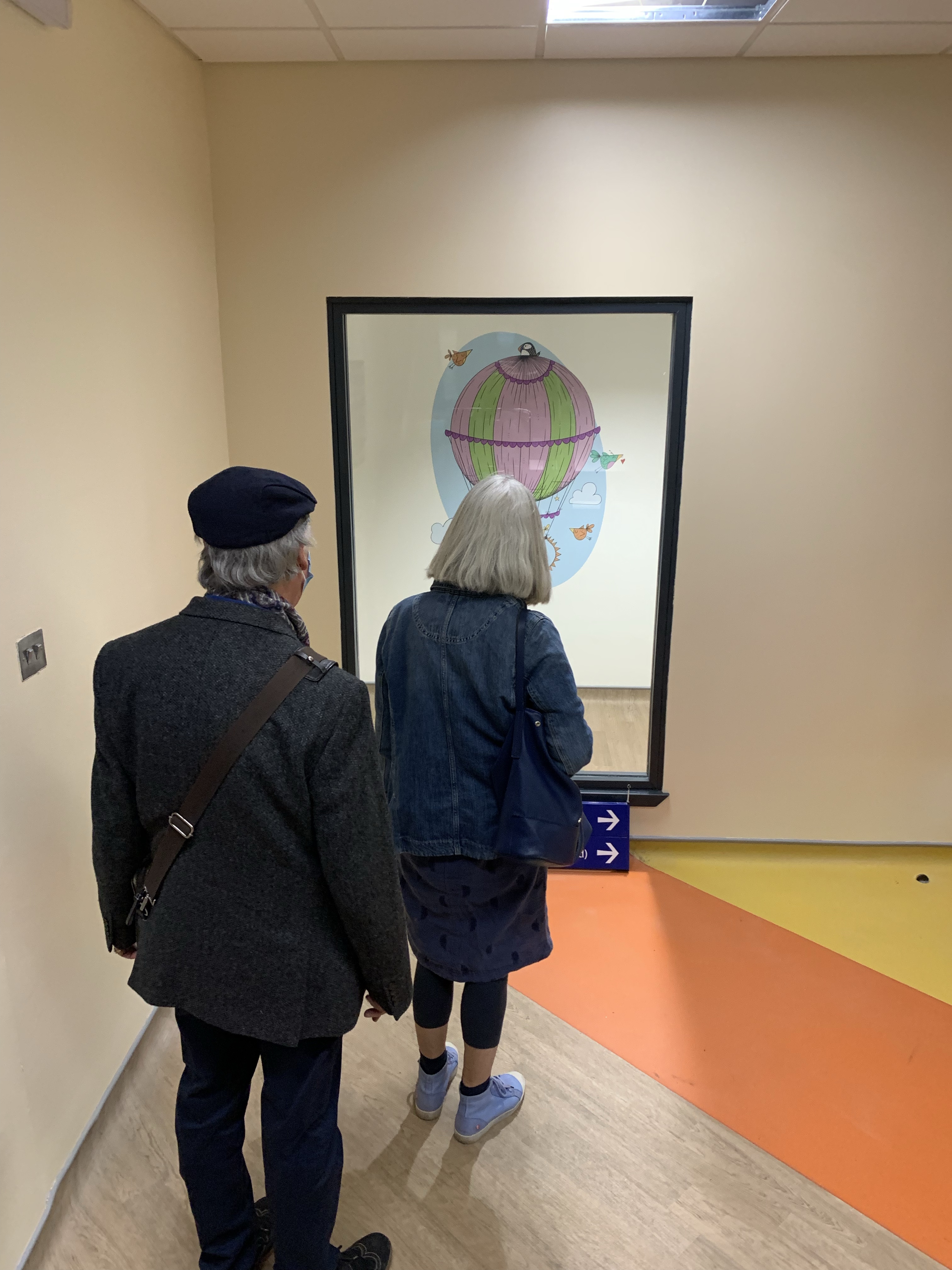 The start of the loop and also the end as my mum and step dad come down the stairs from the main hospital and spy the first piece of art through a window. This is also the final piece of artwork in the corridor out into the stairs/ lift lobby, after saying bye to our cheeky wee seal in her balloon in the discharge lounge.