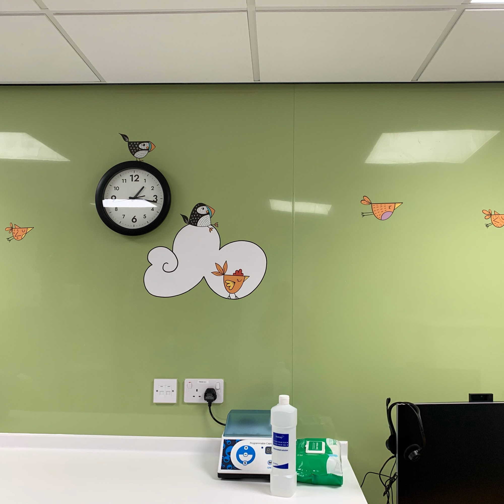 The consultation rooms and other areas such as the weighing zone are situated at the top end of the suite. They were kept light and floaty to tie in with the notion of the start of our journey and being in or following our hot air balloon and feathered friends. I waited until all the furniture and equipment was in place before we installed these pieces, which were designed to be more flexible in their placement.