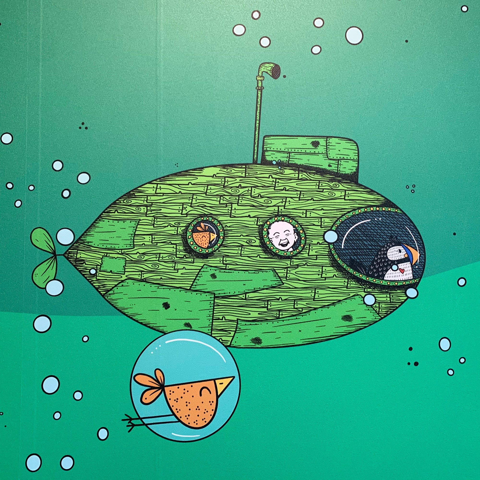Do you recognise your friend the whale from our journey along the corridor? The submarines and Oor Wullie too? Our bird friends have made it as well. Puffins are amazing swimmers under water just like the dolphins and seals and otters… do you think you can keep up? Some of the other birds can’t swim at all, so I made them little swimming bubbles, like deep sea divers helmets so that they can join us too. Can you count the fish in the seaweed?