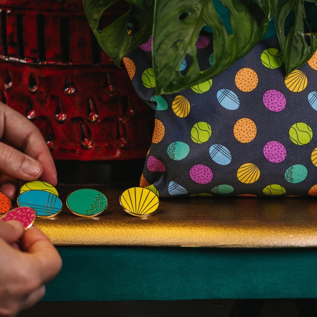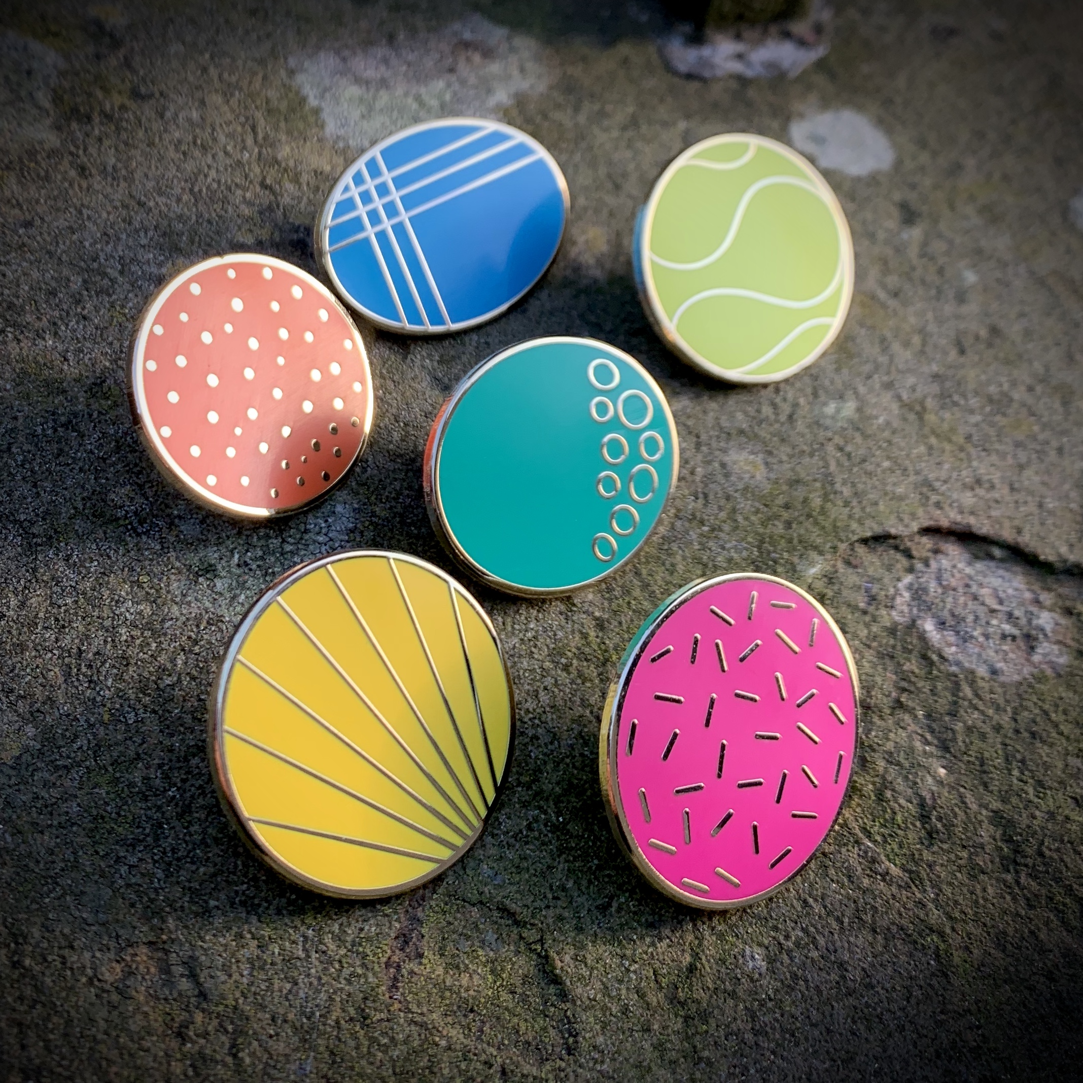 The Dundee Dot Collection is now available from my Etsy shop. They come as beautiful hard enamel pins that go beautifully on coats, bags and look particularly great on your favourite jumper or dress to add a splash of colour and create a talking point. Talking of wearable art, the dots have also been made into a repeating pattern and printed onto 100% cotton. They were then skilfully sewn into beautiful textile pieces right here in Dundee. Tote bags, zip bags/ make up bags and purses – all practical, pretty and all tell the stories of Dundee. If journalling and sketching is your thing there is a hardback notebook available too, perfect to record adventures and note down ideas!